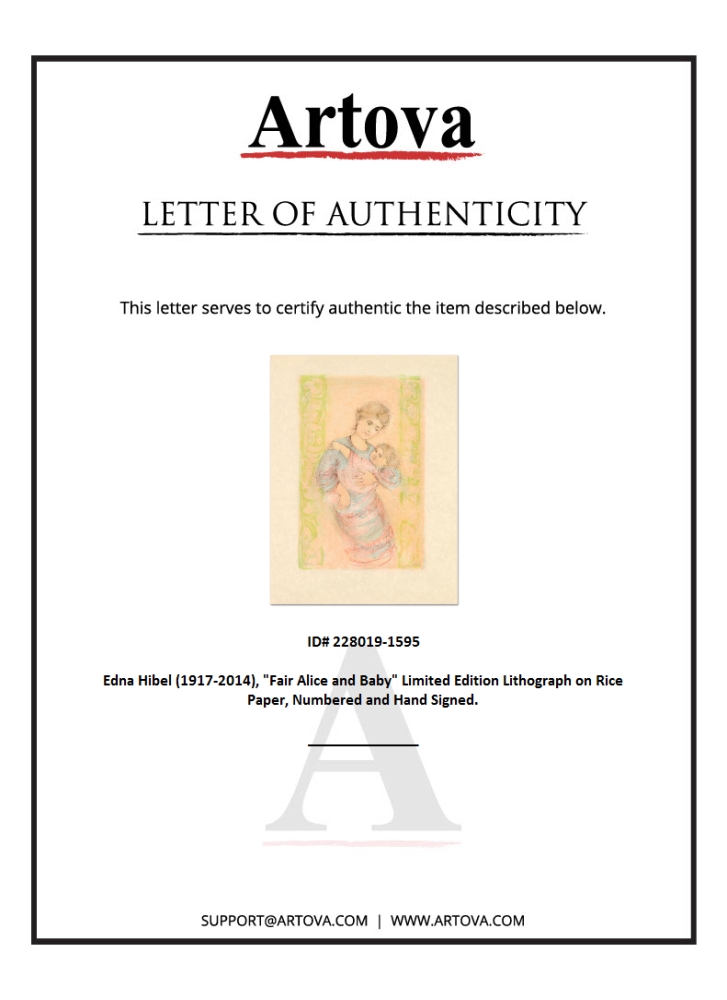 "Fair Alice and Baby" is a limited edition lithograph on rice paper by Edna Hibel (1917-2014), numbered and hand-signed by the artist. Includes Certificate of Authenticity. Measures approx. 20" x 26" (border), 13" x 20" (image).