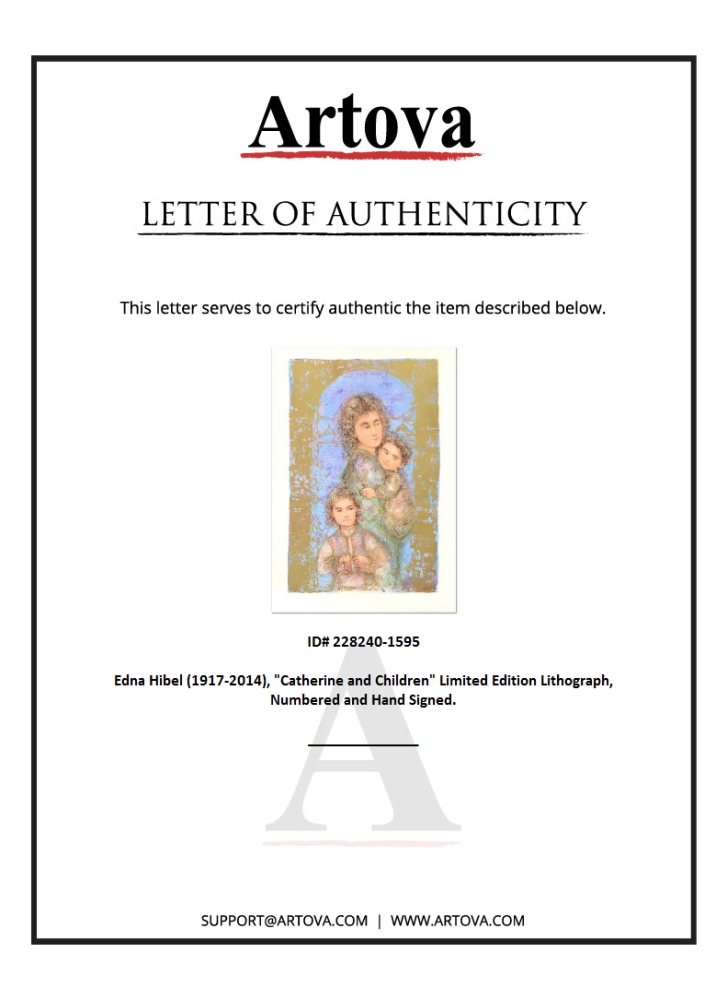 "Catherine and Children" is a limited edition lithograph on paper by Edna Hibel (1917-2014), numbered and hand-signed by the artist. Includes Certificate of Authenticity. Measures approx. 25" x 35" (border), 20" x 31" (image).