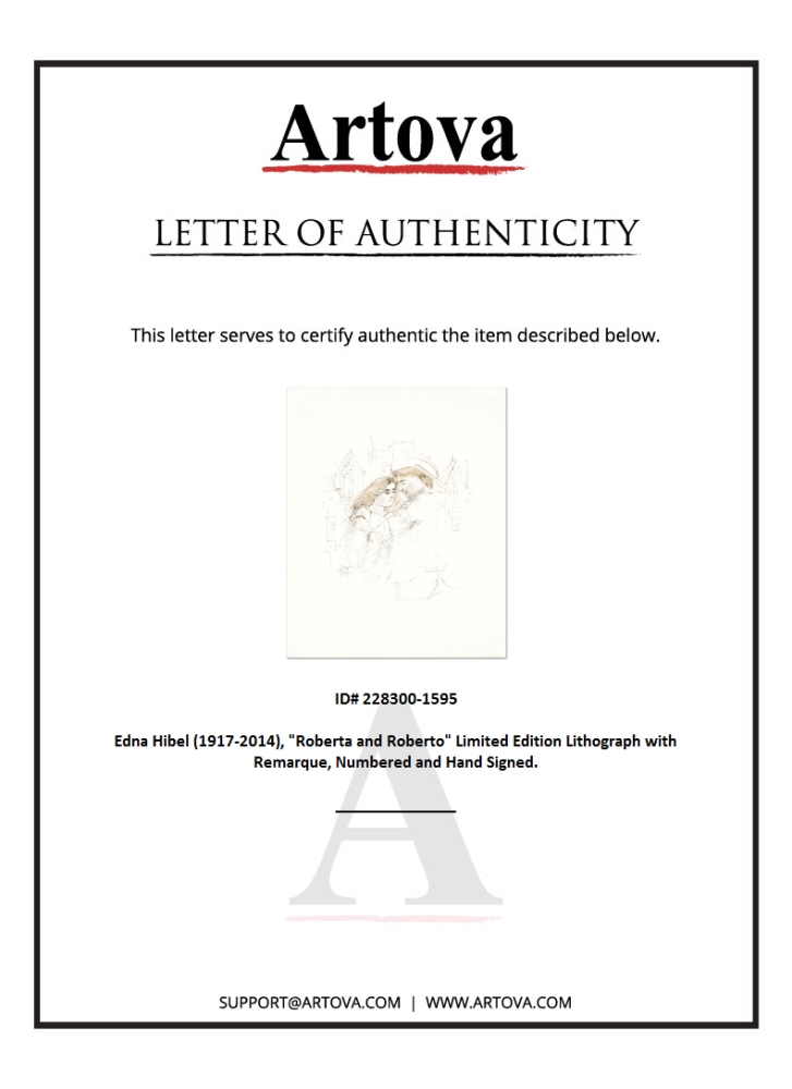 "Roberta and Roberto" is a limited edition lithograph on paper with remarque by Edna Hibel (1917-2014), numbered and hand signed by the artist. Includes Certificate of Authenticity. Measures approx. 5.5" x 8.5" (image).