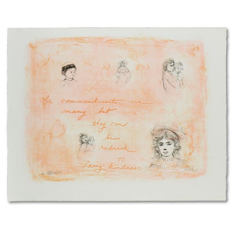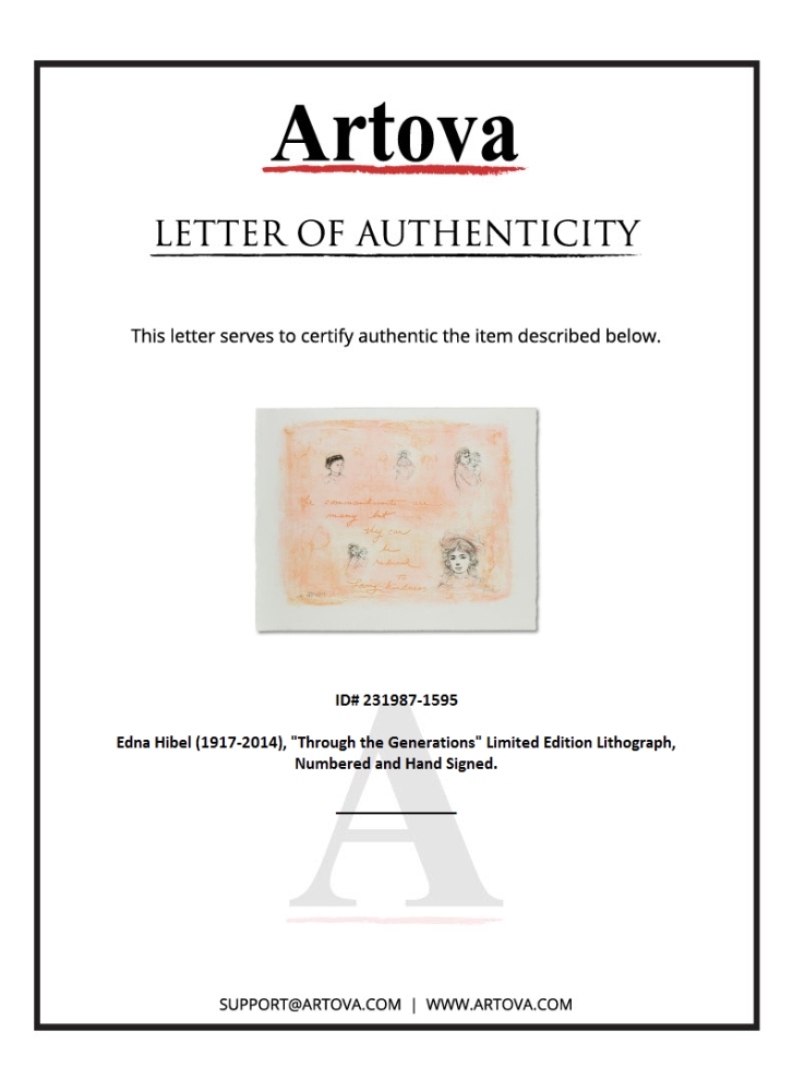 "Through the Generations" is a limited edition lithograph on paper by Edna Hibel (1917-2014), numbered and hand-signed by the artist. Includes Letter of Authenticity. Measures approx. 16" x 12.5" (border), 12" x 9" (image).
