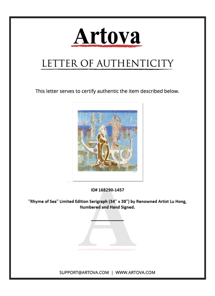 Lu Hong's work, collected worldwide, is often characterized by the use of vibrant colors and emotive lines. "Rhyme of Sea" is a limited edition serigraph on paper that measures approximately 34" x 38" (with border), 29" x 30" (image). Hand-signed by Lu Hong (Artist).