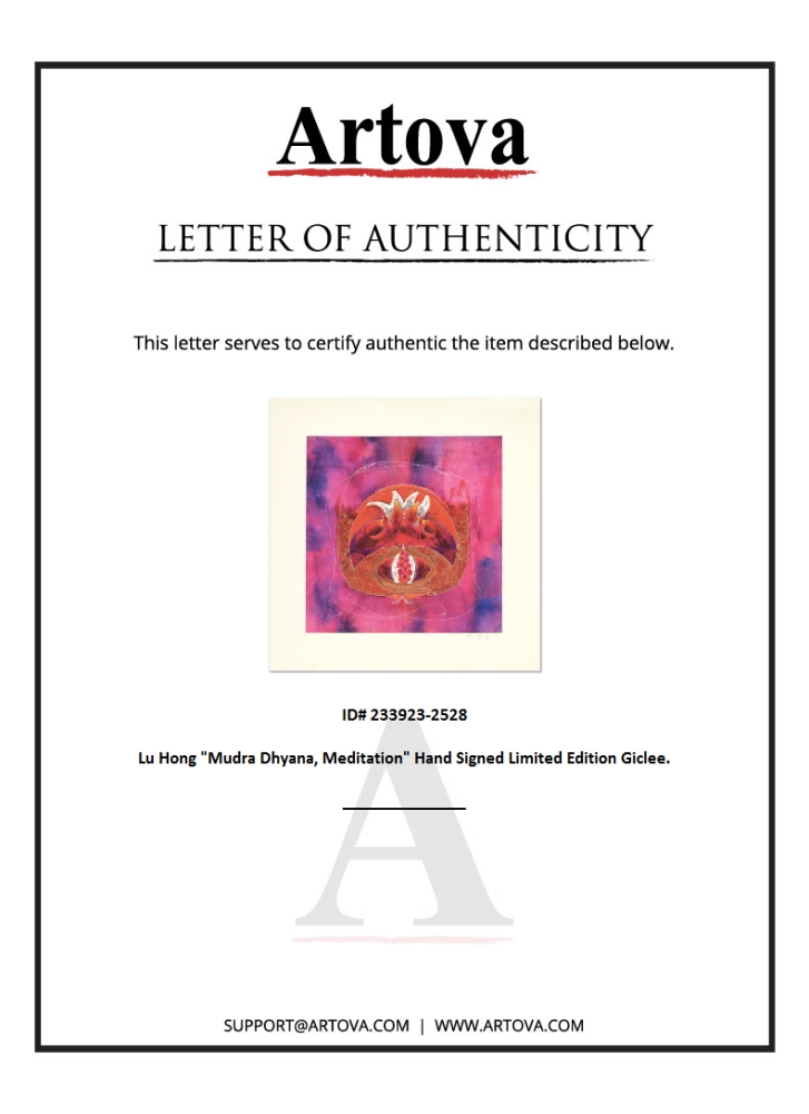 "Mudra Dhyana, Meditation" is an limited edition giclee on canvas, by Lu Hong. Hand-signed by the artist, this piece comes with a letter of authenticity. Measures approx. 10" x 10" (image).