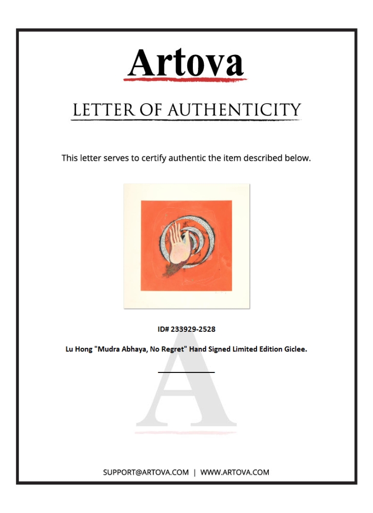 "Mudra Abhaya, No Regret" is an limited edition giclee on canvas, by Lu Hong. Hand-signed by the artist, this piece comes with a letter of authenticity. Measures approx. 10" x 10" (image).