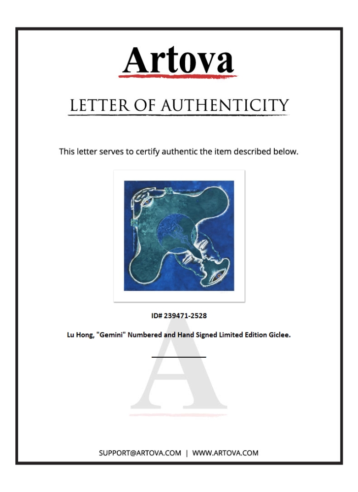The zodiac is a phenomenological study, formed by coordination between 12 specific constellations in space and birth of one specific human being in time, contrasting 12 signs that guide the meditation of love, fate and purpose of one's life. "Gemini (5/21 - 6/21)" is a limited edition giclee on paper by talented Chinese artist Lu Hong, numbered and hand signed by the artist! Measures approx. 24" x 24" (with border), 20" x 20" (image).