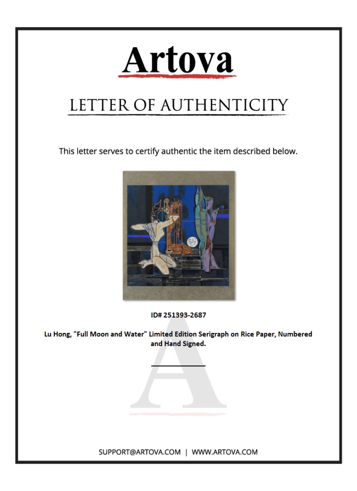 "Full Moon and Water" is a limited edition serigraph on rice paper by Lu Hong, numbered and hand-signed by the artist. Includes Letter of Authenticity. Measures approx. 32" x 38" (with border), 29" x 29" (image).