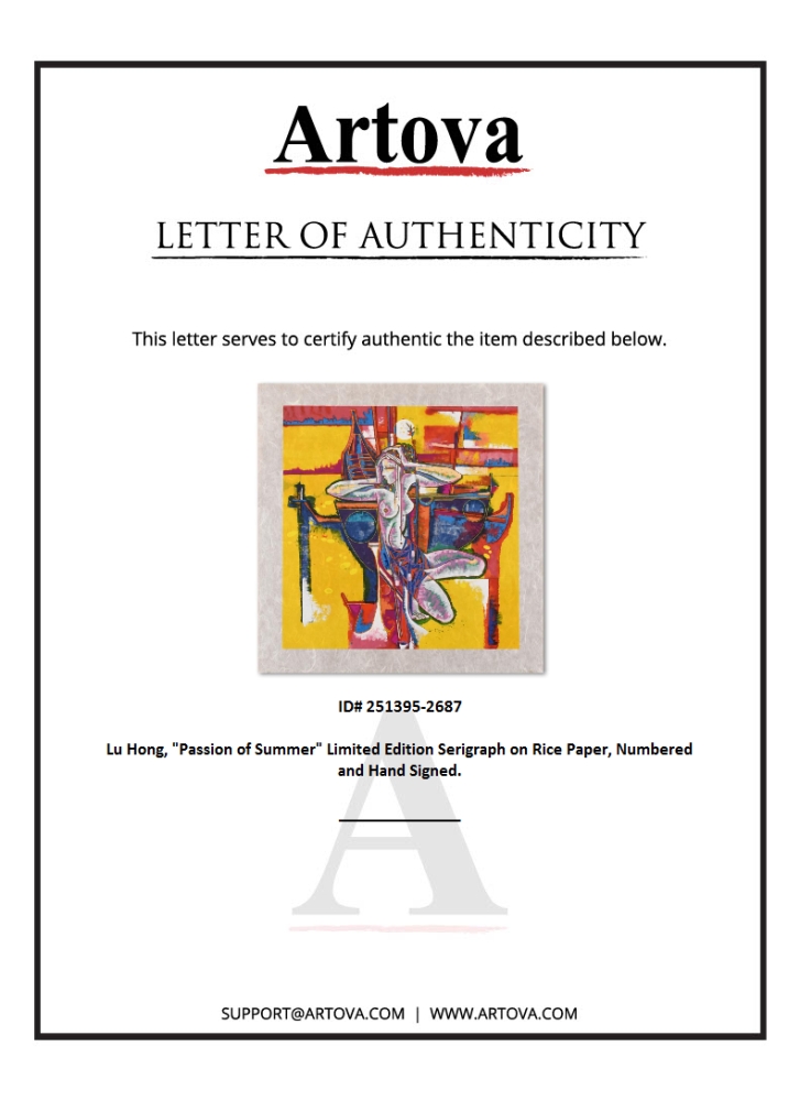 "Passion of Summer" is a limited edition serigraph on rice paper by Lu Hong, numbered and hand-signed by the artist. Includes Letter of Authenticity. Measures approx. 36.5" x 37" (with border), 30" x 31" (image).