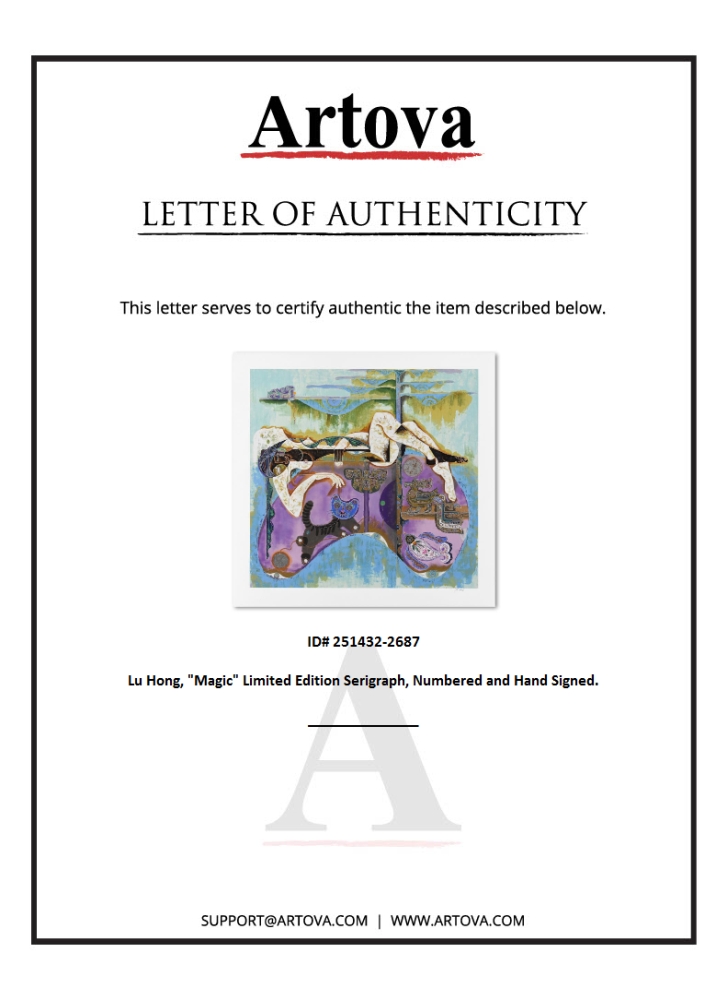 "Magic" is a limited edition serigraph on paper by Lu Hong, numbered and hand-signed by the artist. Includes Letter of Authenticity. Measures approx. 38" x 37" (with border), 33" x 32" (image).