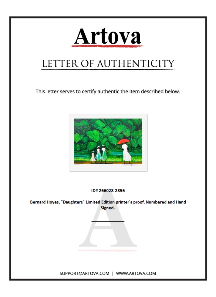 "Daughters" is a limited edition printer's proof serigraph on paper by Bernard Hoyes, numbered and hand signed by the artist. Includes Letter of Authenticity. Measures approx. 24" x 32.5" (border), 19" x 28.5" (image).