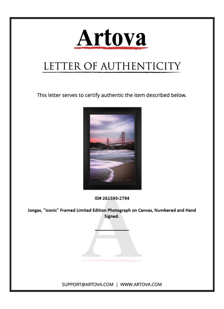 "Iconic" is a limited edition giclee on canvas by photographer Jongas, numbered and hand-signed by the artist. The piece comes custom framed and includes Letter of Authenticity. Measures approximately 38" x 28" (framed); 30" x 20" (image).