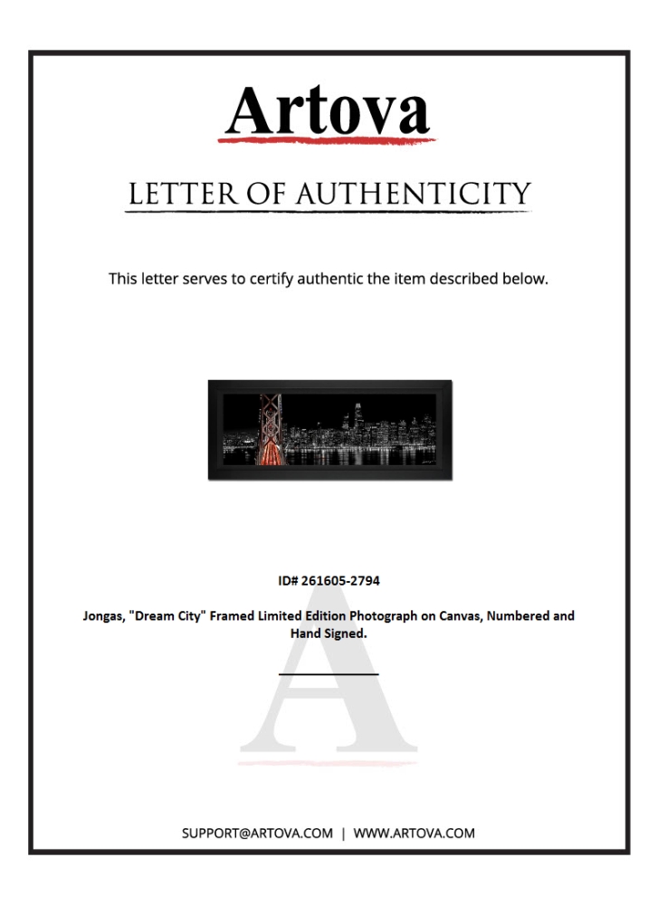"Dream City" is a limited edition giclee on canvas by photographer Jongas, numbered and hand-signed by the artist. The piece comes custom framed and includes Letter of Authenticity. Measures approximately 20" x 44" (framed); 12" x 36" (image).