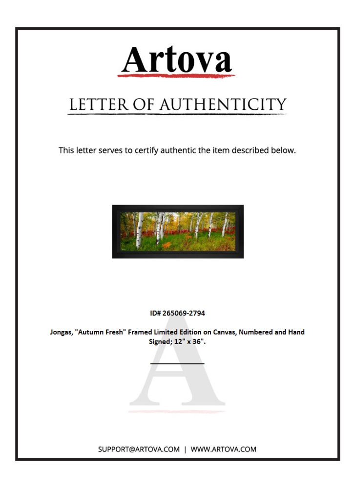 "Autumn Fresh" is a limited edition giclee on canvas by photographer Jongas, numbered and hand signed by the artist. The piece comes custom framed and includes Letter of Authenticity. Measures approximately 20" x 44" (framed); 12" x 36" (image).