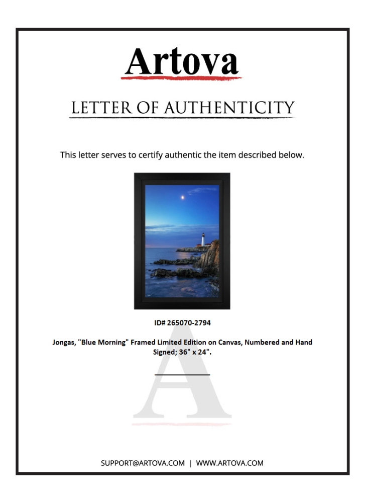 "Blue Morning" is a limited edition giclee on canvas by photographer Jongas, numbered and hand signed by the artist. The piece comes custom framed and includes Letter of Authenticity. Measures approximately 42" x 30" (framed); 34" x 22" (image).