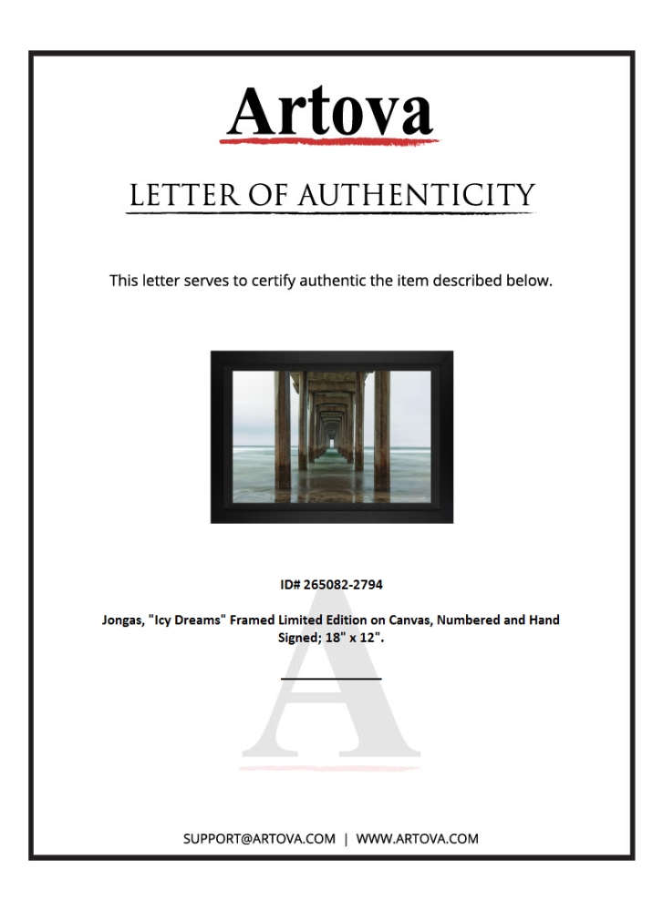"Icy Dreams" is a limited edition giclee on canvas by photographer Jongas, numbered and hand signed by the artist. The piece comes custom framed and includes Letter of Authenticity. Measures approximately 26" x 20" (framed); 18" x 12" (image).