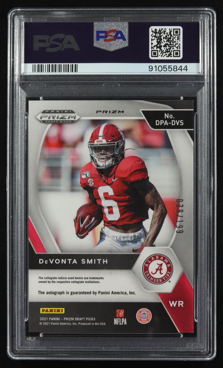 Devonta Smith 2021 Panini Draft Picks Red Prizm Auto #DPA-DVS RC #039/199 (PSA 10)