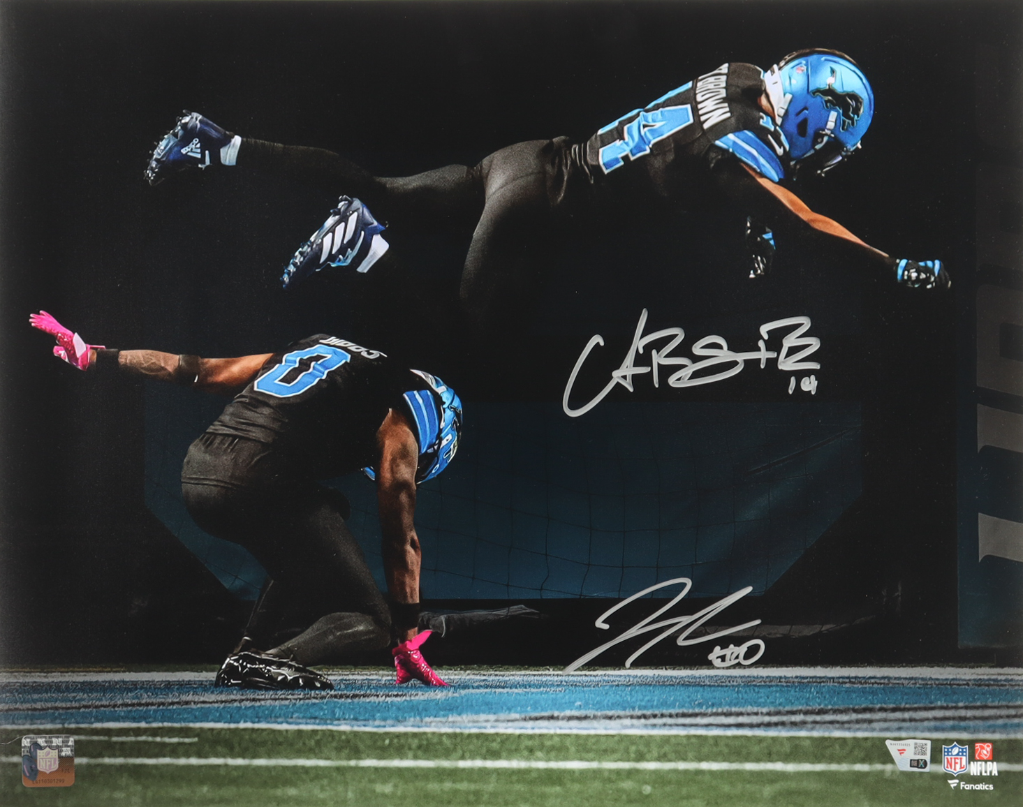 Photo measures 16" x 20" in size. Hand-signed by Amon-Ra St. Brown and Jahmyr Gibbs (Detroit Lions).