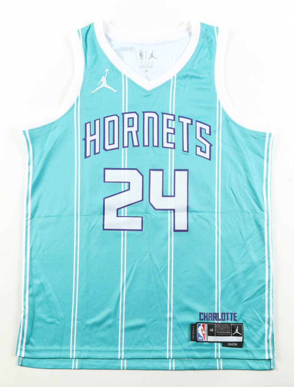 Jordan authentic jersey with everything pressed on, size 48. Hand-signed by Brandon Miller (Charlotte Hornets).