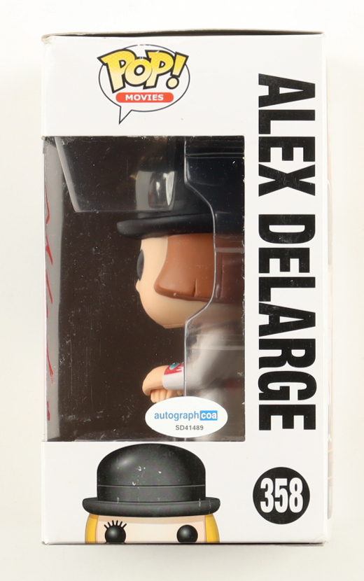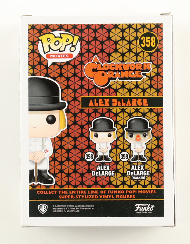 Funko Pop! Vinyl figure measures approximately 4" tall and has been hand-signed on the packaging by Malcolm McDowell. Item has been window-swapped. Please note the denting and scuffing on the packaging.