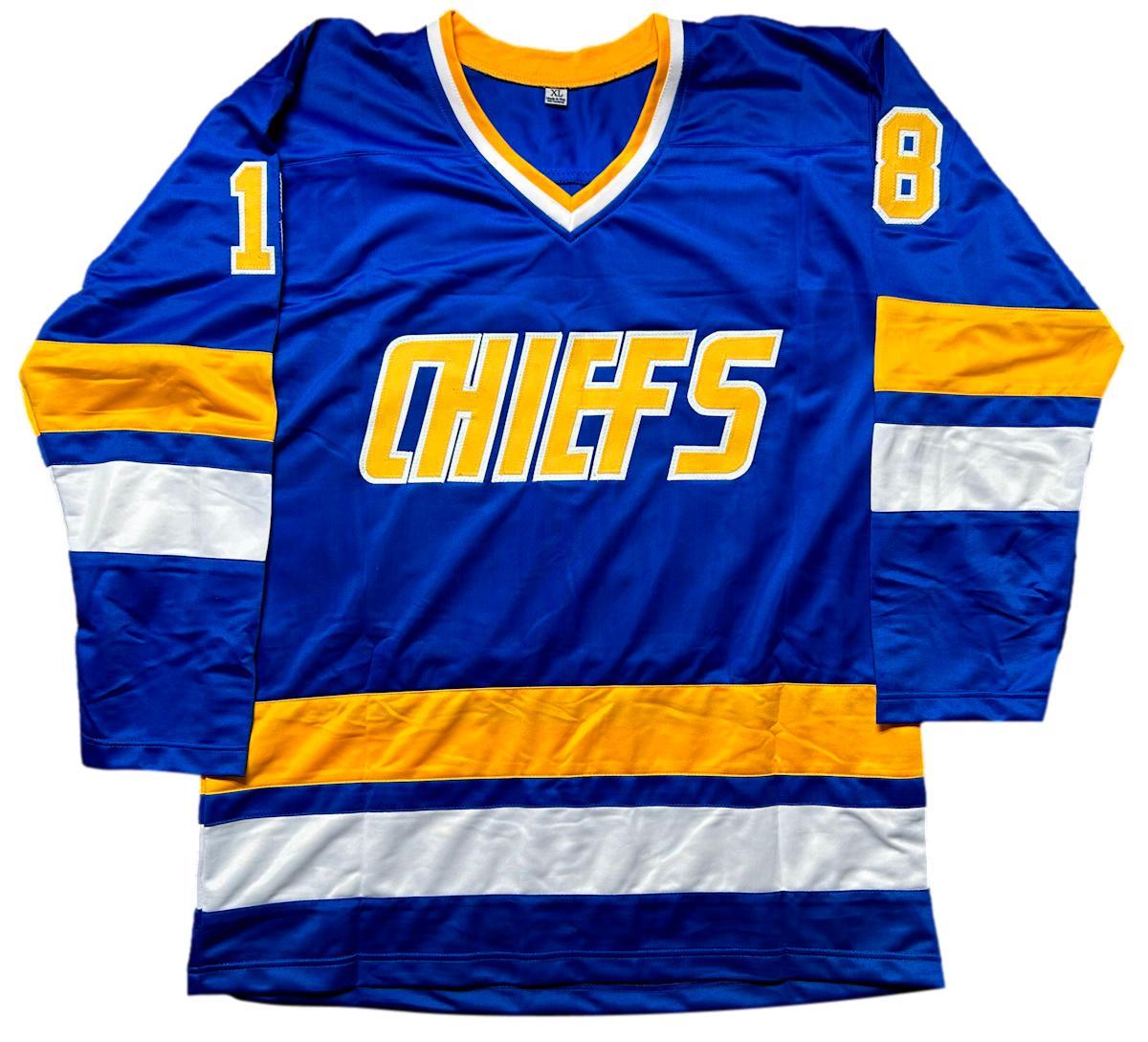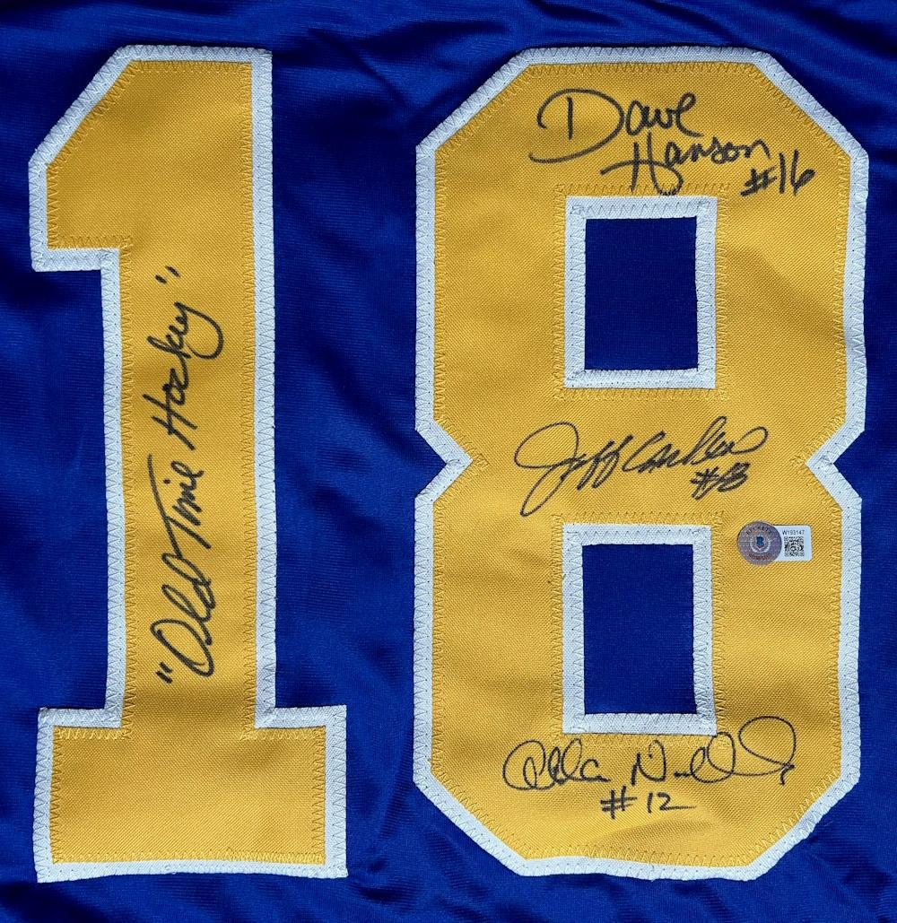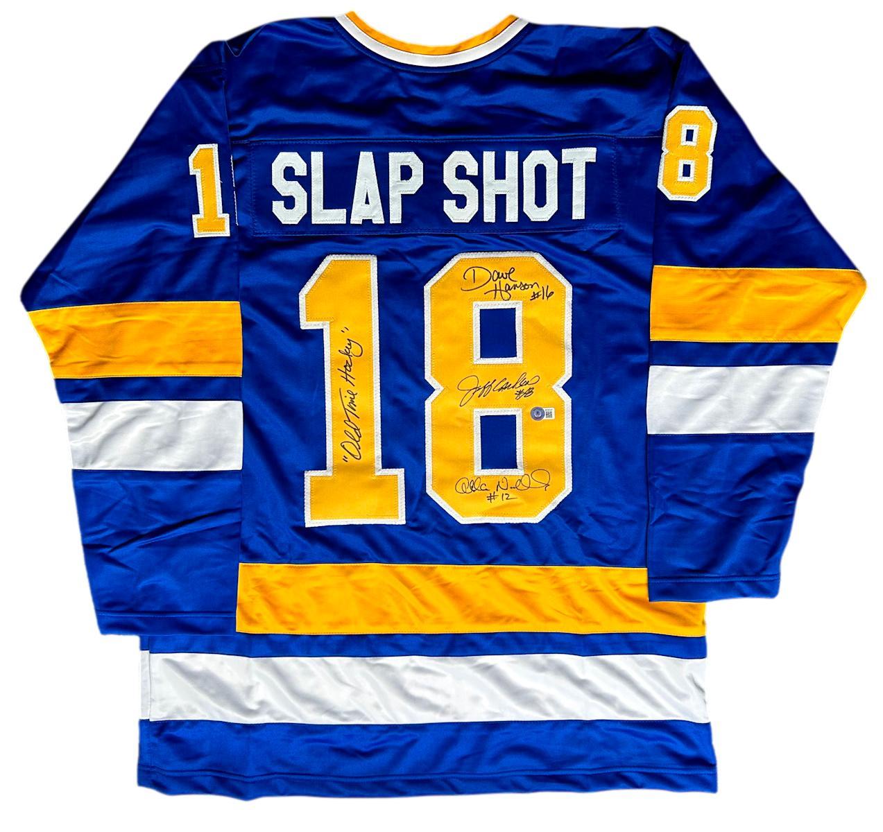 Custom jersey. Everything is sewn on, size XL. Hand-signed and inscribed by Dave Hanson, Allan Nicholls, and Jeff Carlson (The Hanson Brothers).