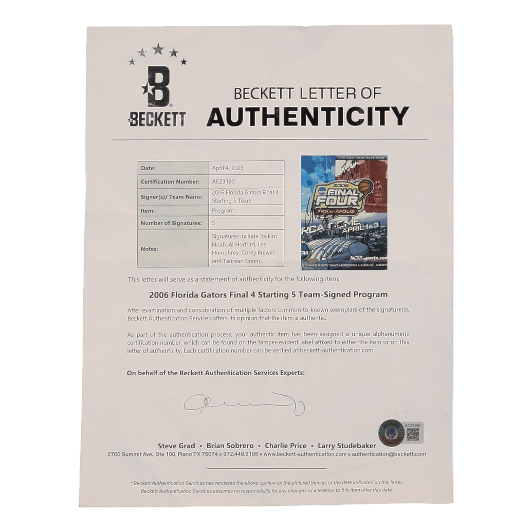 2006 Florida Gators Final Four NCAA Program Team-Signed by the Starting (5) with Joakim Noah, Al Horford, Lee Humphrey, Corey Brewer (Beckett)