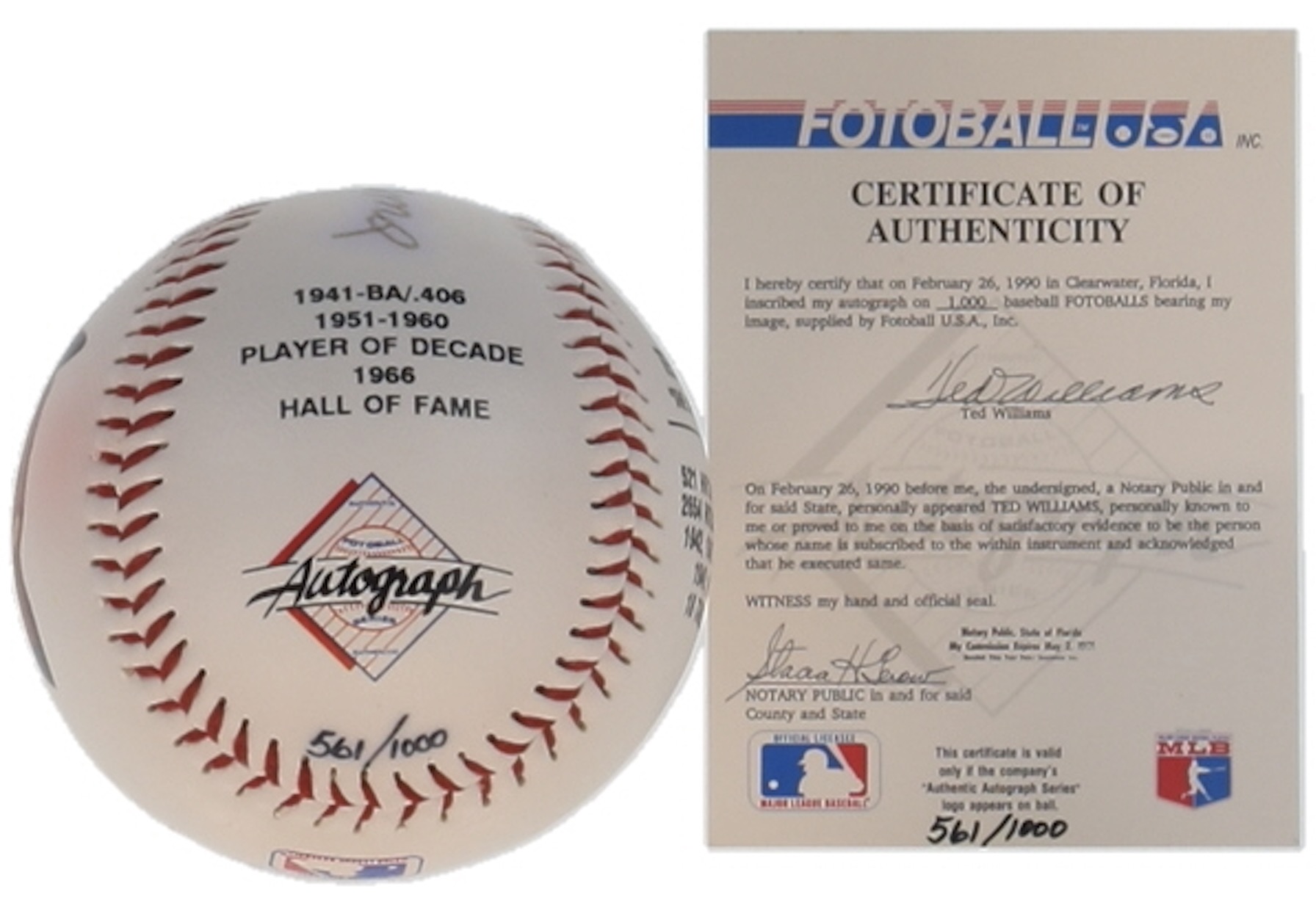 Fotoball commemorative baseball. Hand-signed by Ted Williams (D. 2002, Boston Red Sox, HOF). Limited edition #561/1,000.