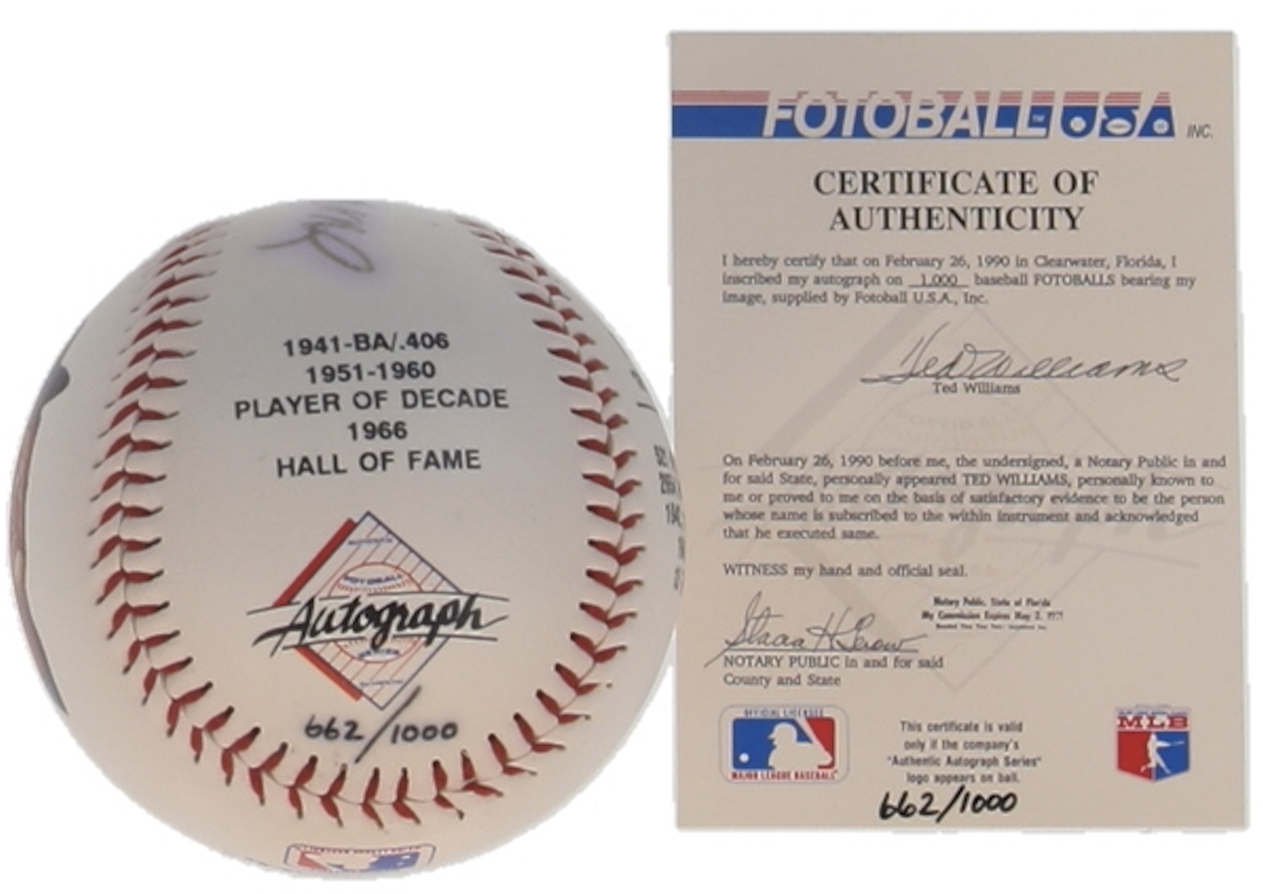 Fotoball commemorative baseball. Hand-signed by Ted Williams (D. 2002, Boston Red Sox, HOF). Limited edition #662/1,000.