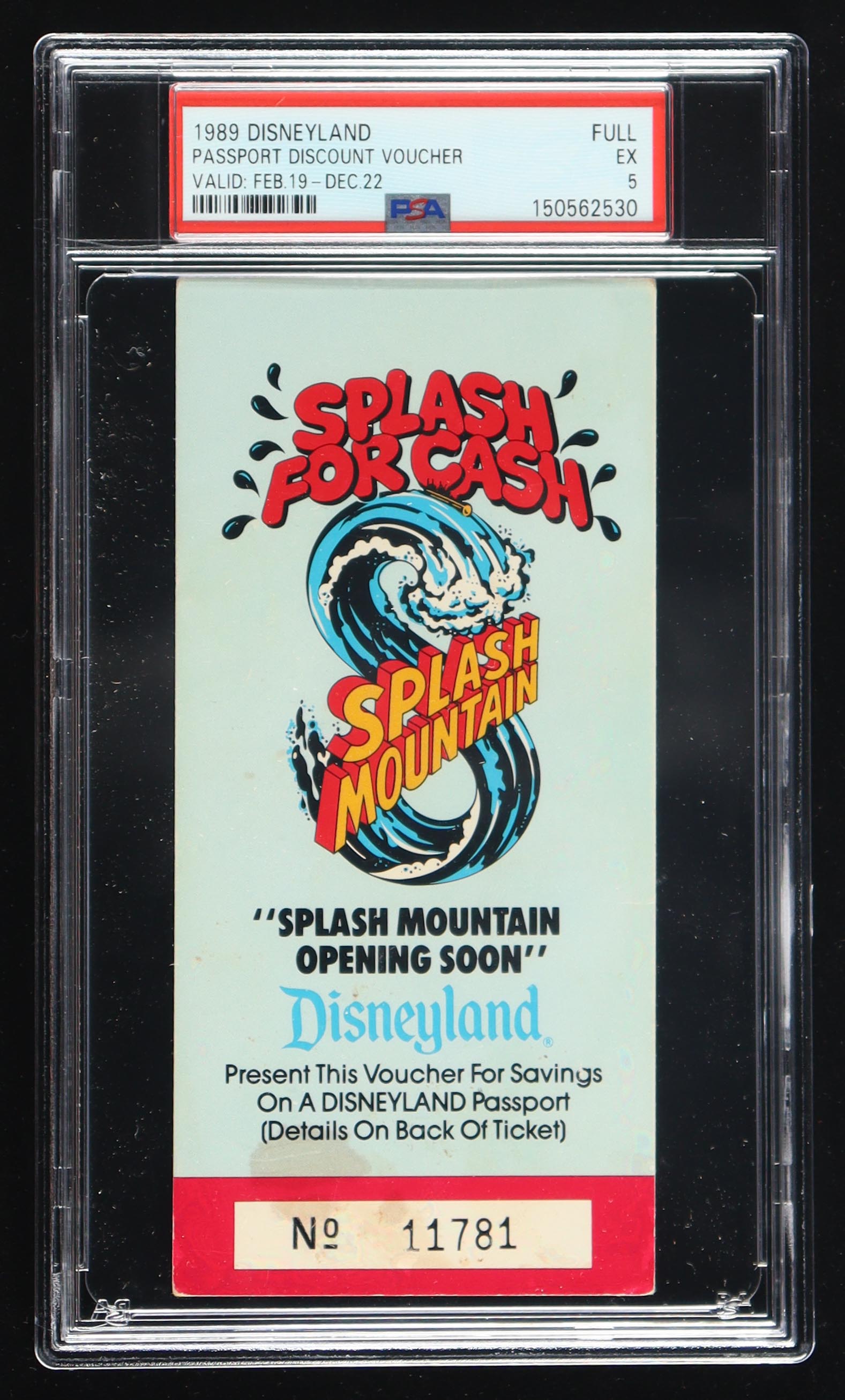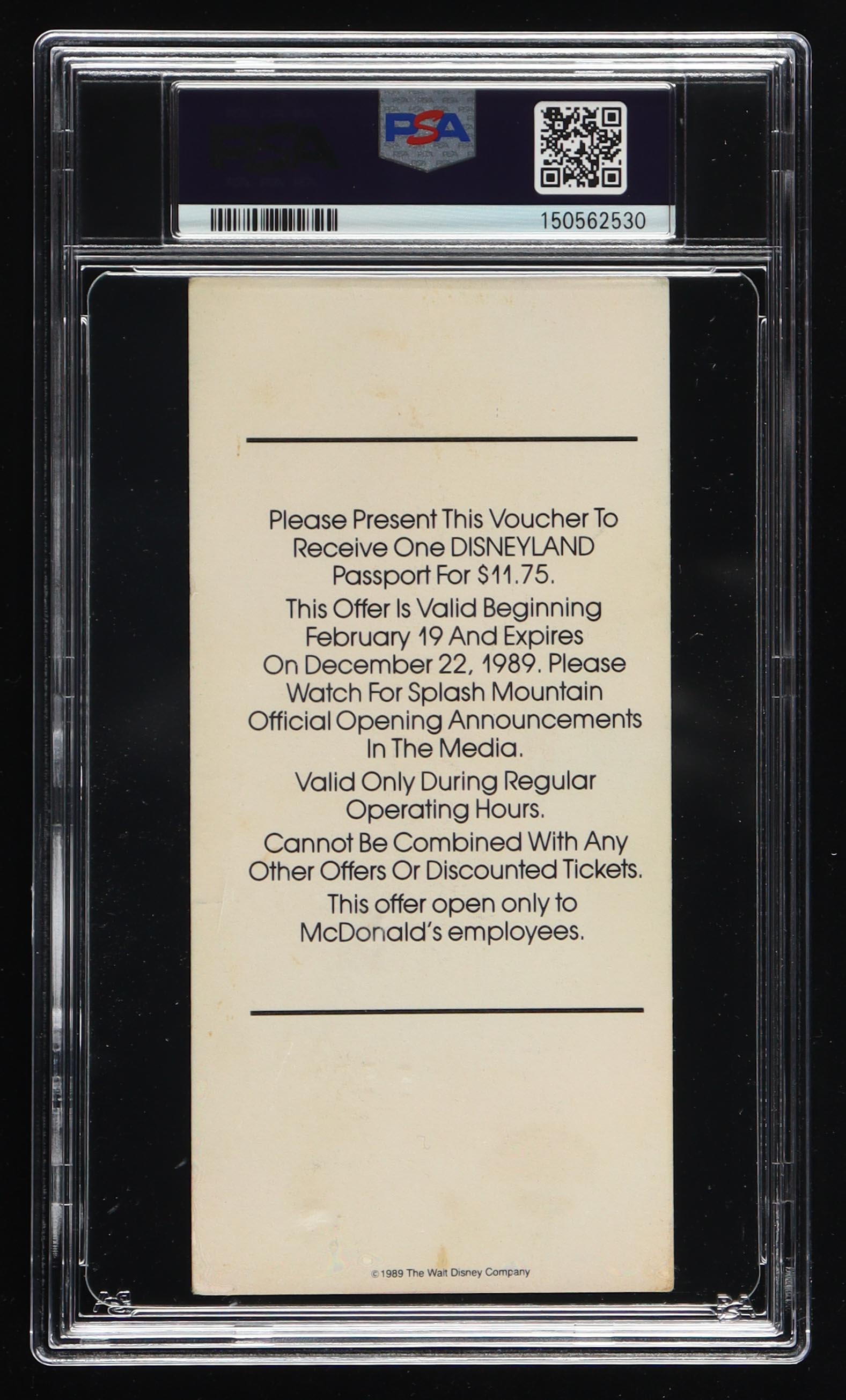 1989 Splash Mountain "Opening Soon" Voucher has been graded (PSA 5). Please see photos for details regarding the item.