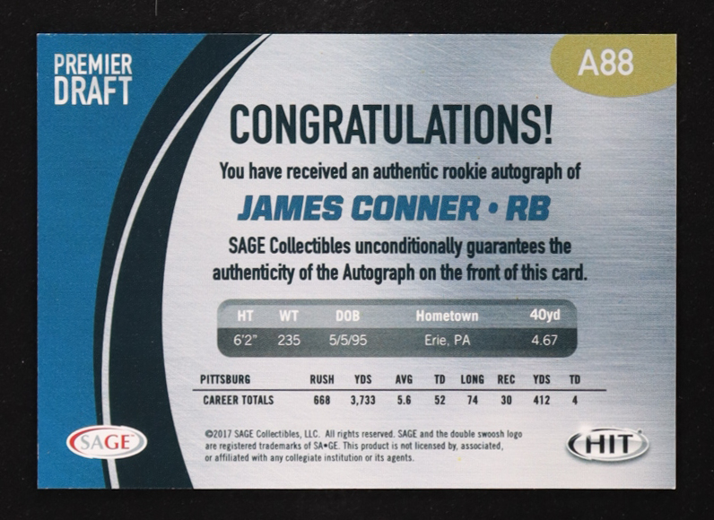 James Conner 2017 Sage Premier Draft Rookie Autographs Gold #A88 RC #148/250