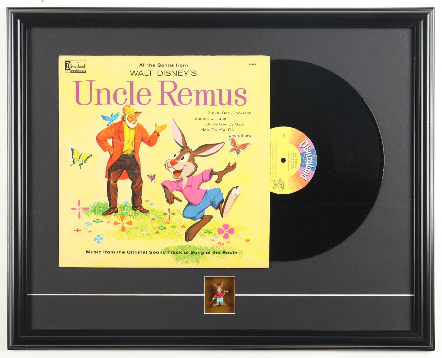 Vintage Walt Disney 1963 "Uncle Remus" Custom Framed Retired Characters Vintage Vinyl Record Display With B'rer Rabbit Figurine