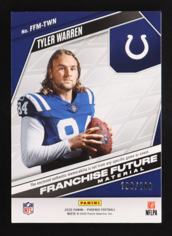 Tyler Warren 2025 Panini Phoenix Franchise Future Material Blue #FFM-TWN RC #196/199