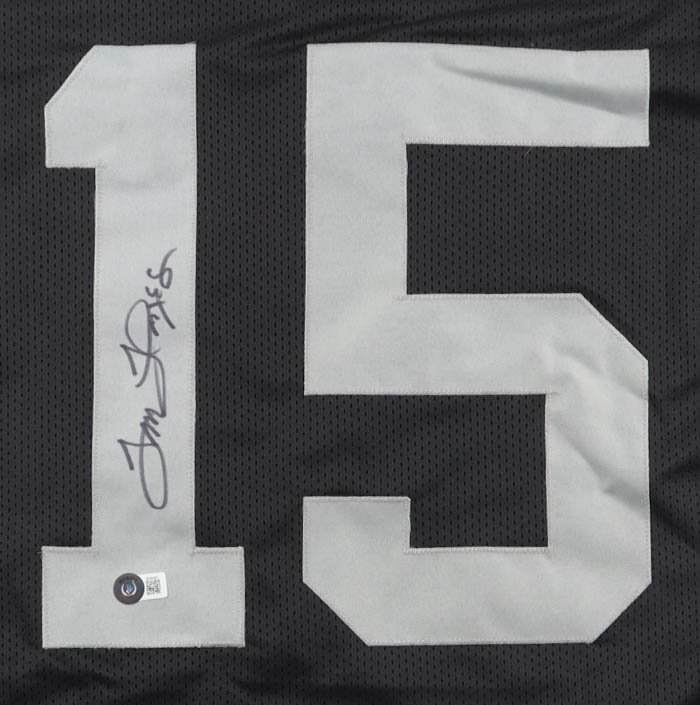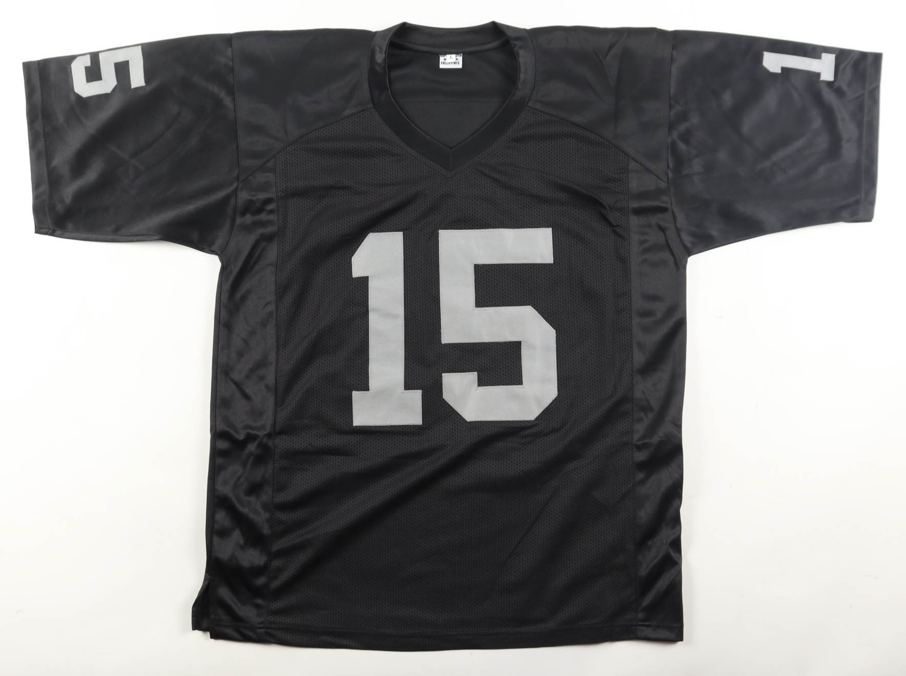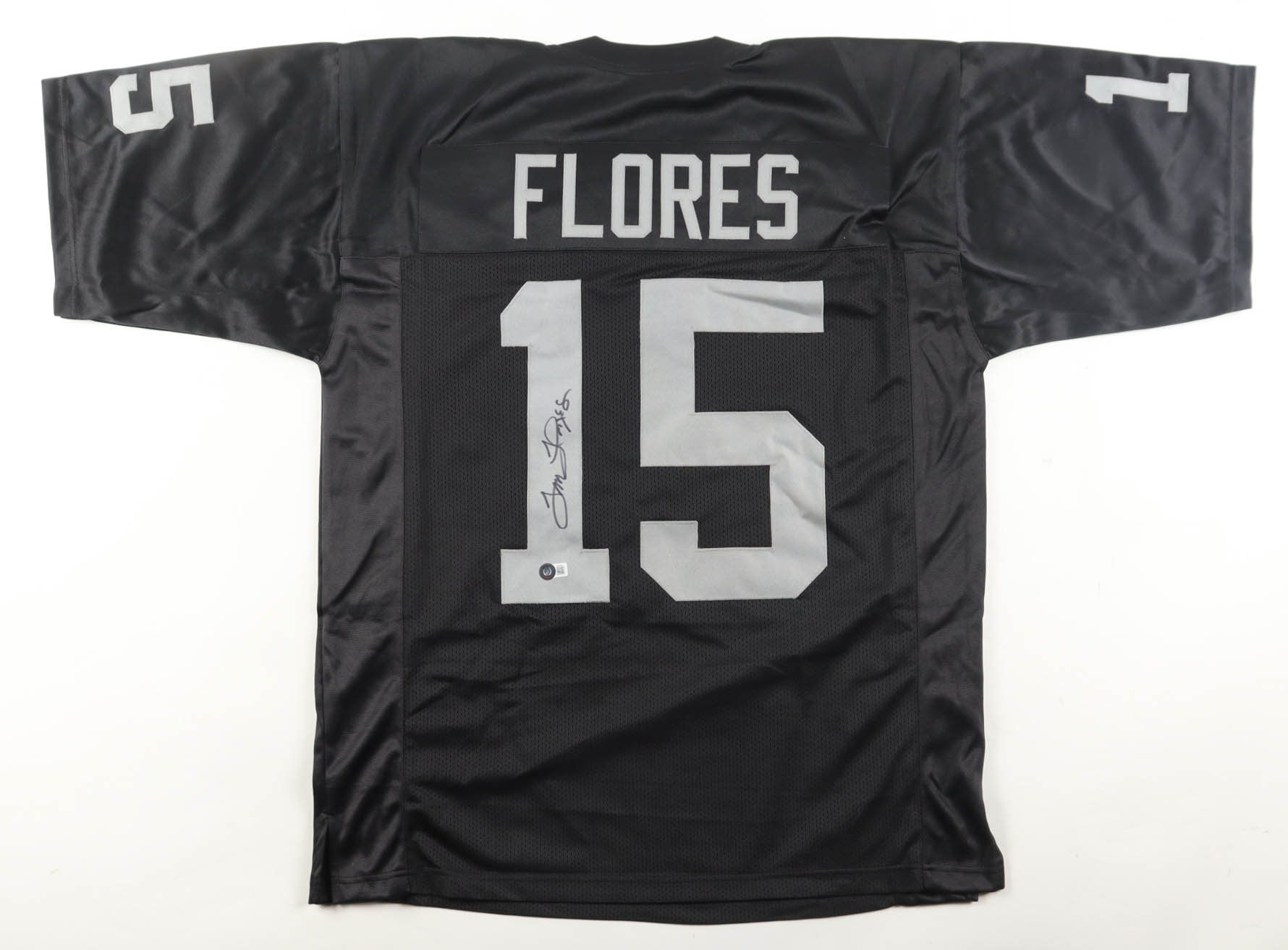 Custom jersey with everything sewn on, size L. Hand-signed by Tom Flores (HOF).