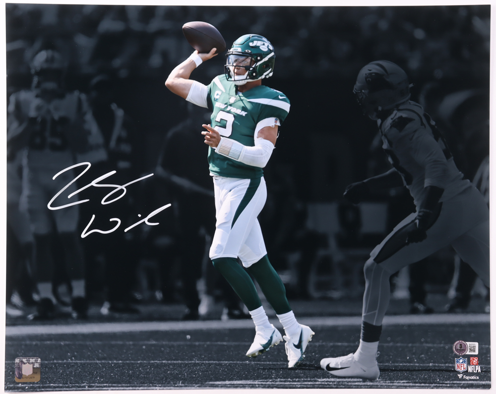 Photo measures approximately 16" x 20" in size and has been hand-signed by Zach Wilson (New York Jets).