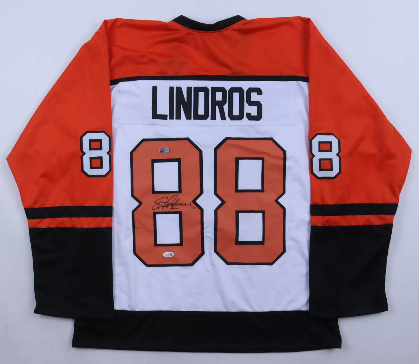 Custom jersey with everything sewn on, size XL. Hand-signed by Eric Lindros (Philadelphia Flyers, HOF).