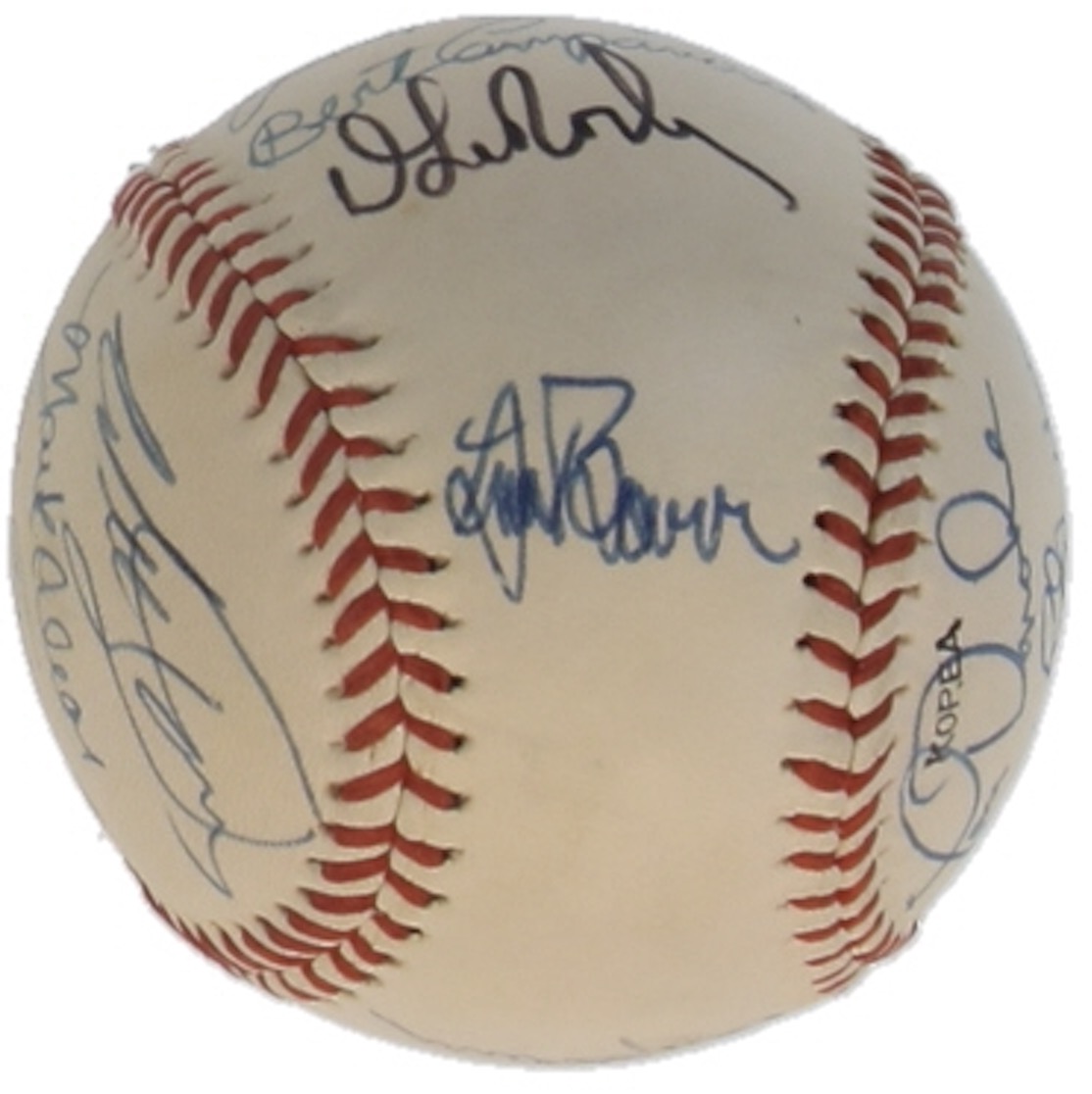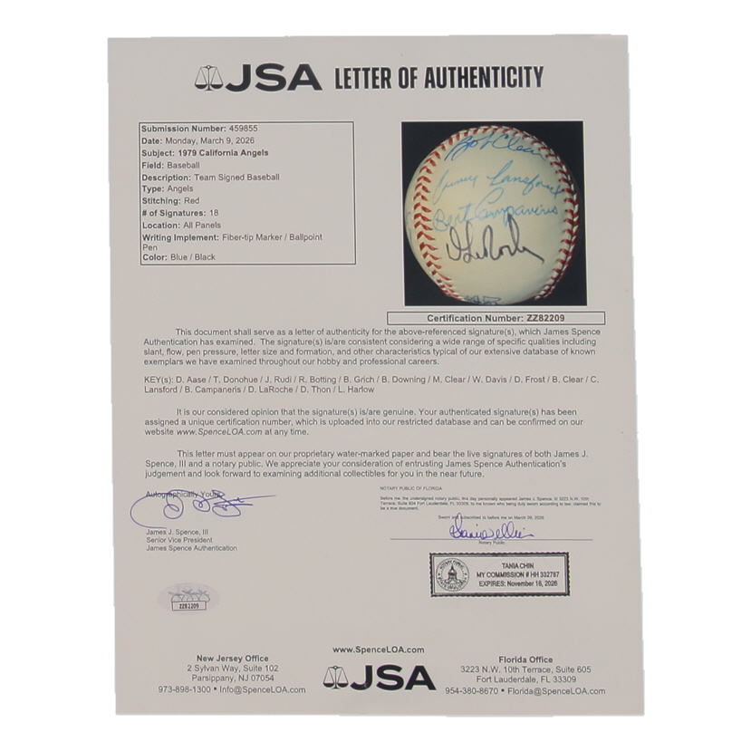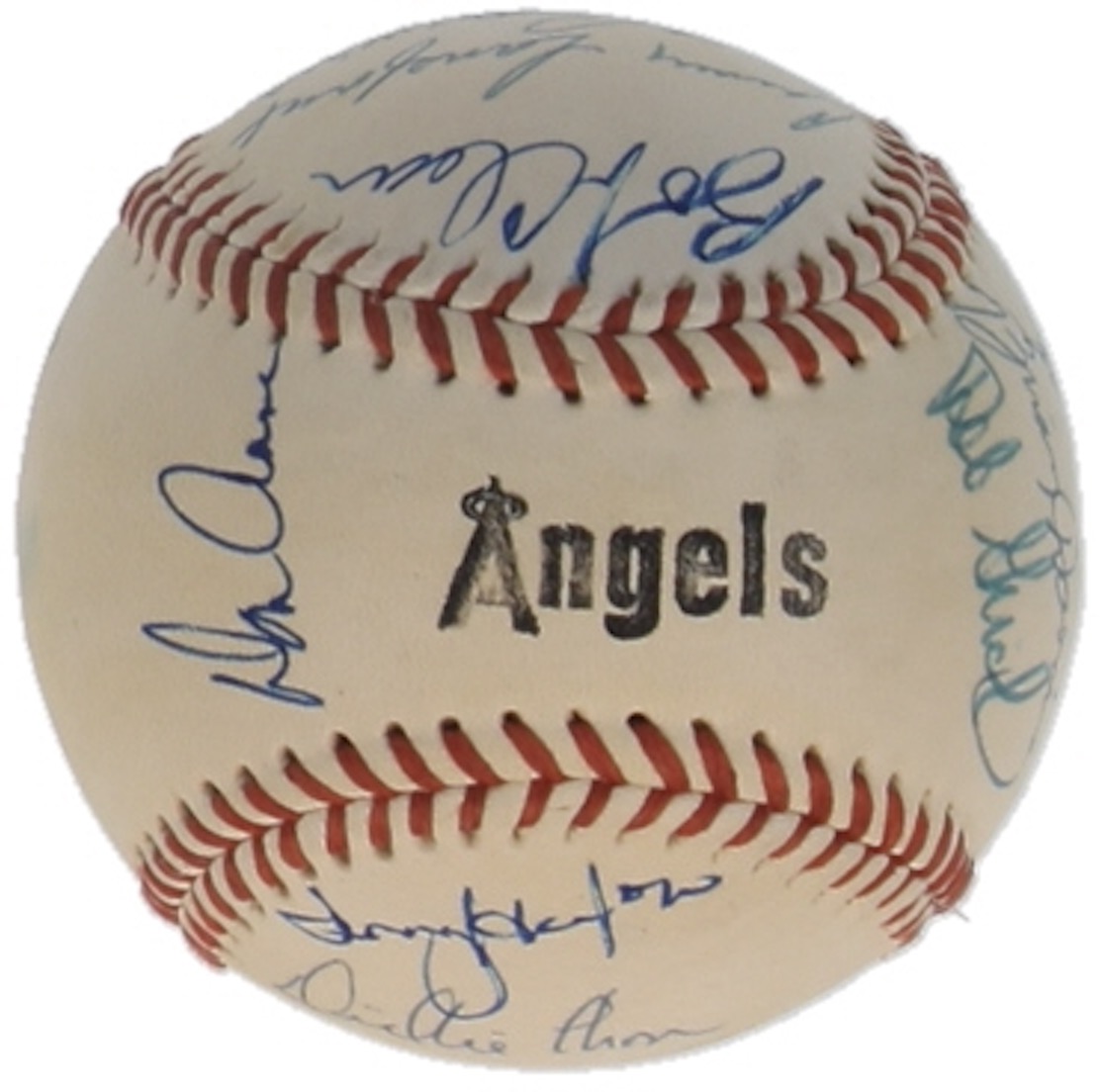 California Angels logo baseball has been hand-signed by (18) with Don Aase, Tom Donohue, Joe Rudi, Rick Botting, Bobby Grich, Brian Downing, Mark Clear, Willie Davis, Dave Frost, Bob Clear, Carney Lansford, Bert Campaneris, Dave LaRoche, Dickie Thon, Lynn Harlow and (3) others.