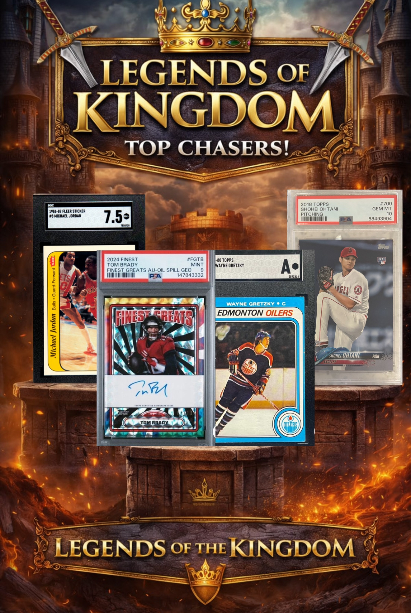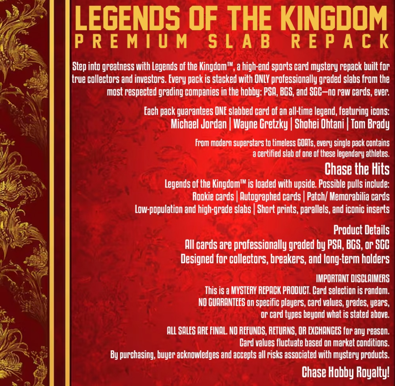 Step into greatness with Legends of the Kingdom™, a high-end sports card mystery repack built for true collectors and investors. Every pack is stacked with ONLY professionally graded slabs from the most respected grading companies in the hobby: PSA, BGS, and SGC—no raw cards, ever.