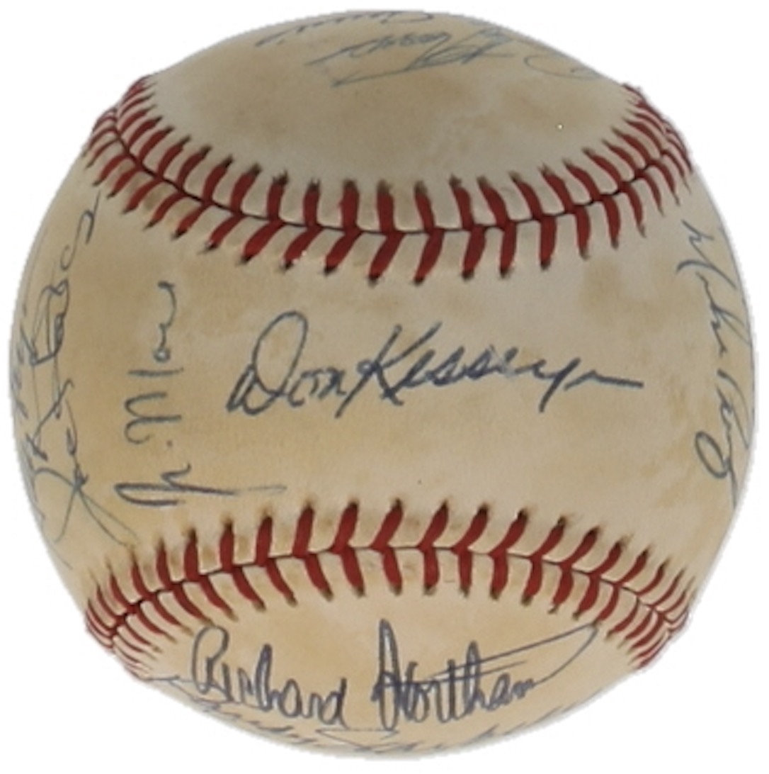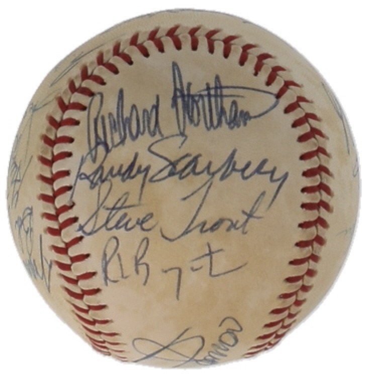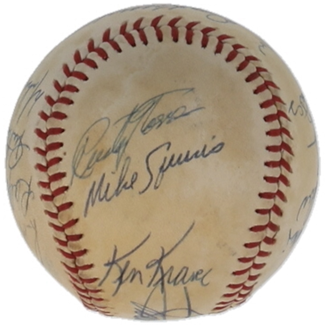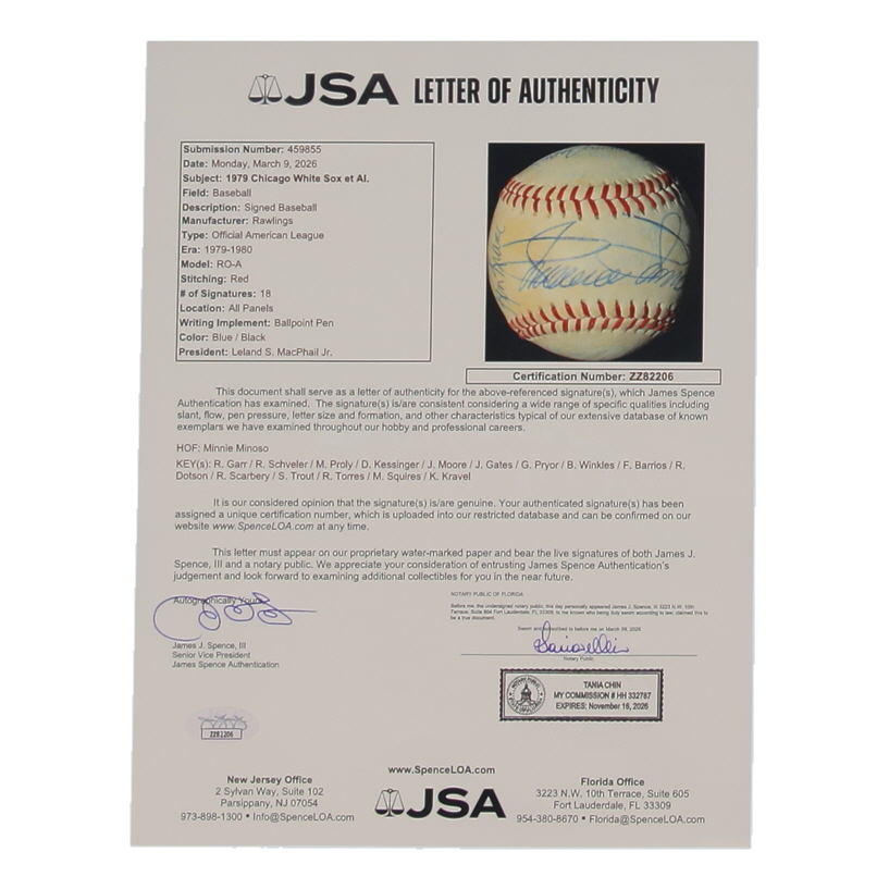 Rawlings Official American League baseball has been hand-signed by (18) with Minnie Minoso, Ralph Garr, Rick Schueler, Mike Proly, Don Kessinger, Junior Moore, Jim Gates, Greg Pryor, Bobby Winkles, Francisco Barrios, Richard Dotson, Randy Scarbery, Steve Trout, Rusty Torres, Mike Squires, Ken Kravec and (2) others.