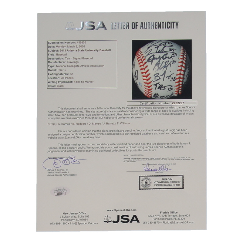 2011 ASU Sun Devils NCAA Baseball Team-Signed by (32) with Austin Barnes, Brady Rodgers, Deven Marrero, Jake Barrett (JSA)