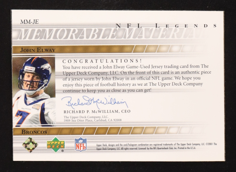 John Elway 2001 Upper Deck NFL Legends Memorabilia Materials #MM-JE