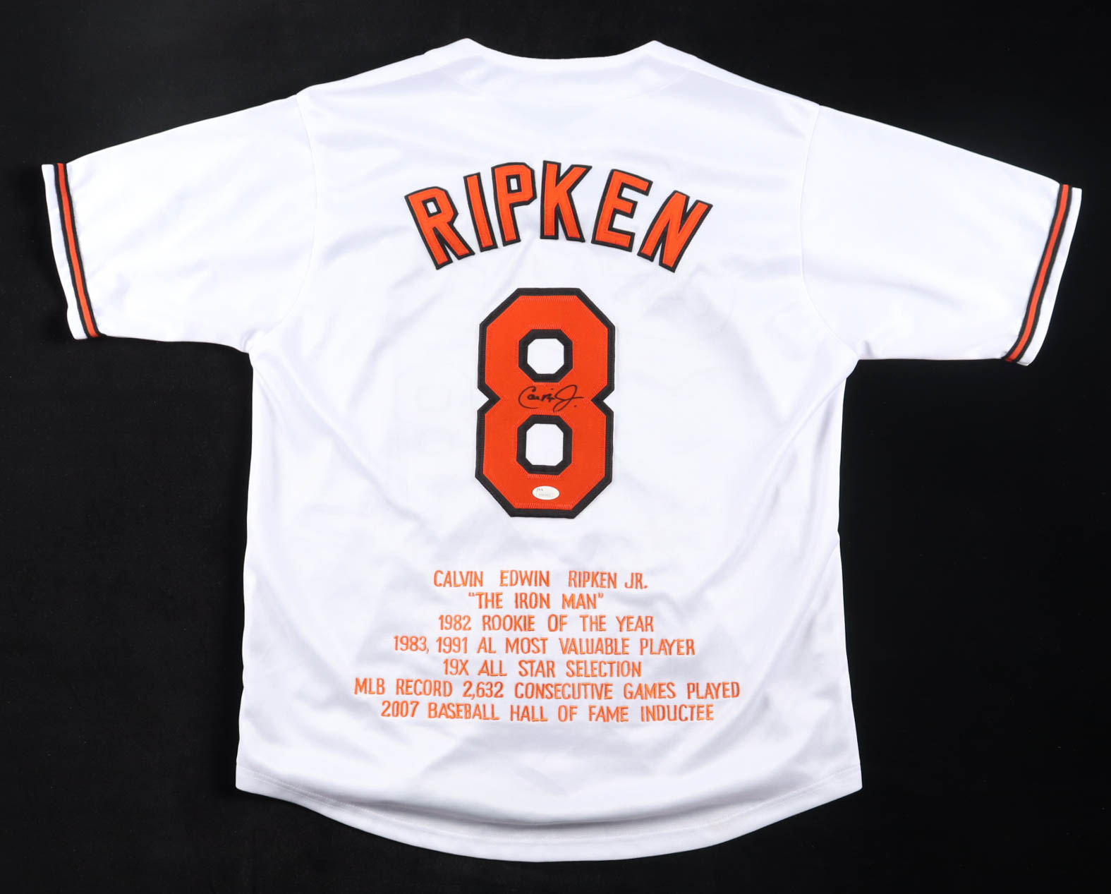 Custom jersey with everything sewn on, size XL. Hand-signed by Cal Ripken Jr. (Baltimore Orioles, HOF). Ripken's career highlight statistics have been custom-stitched below the reverse numbers.