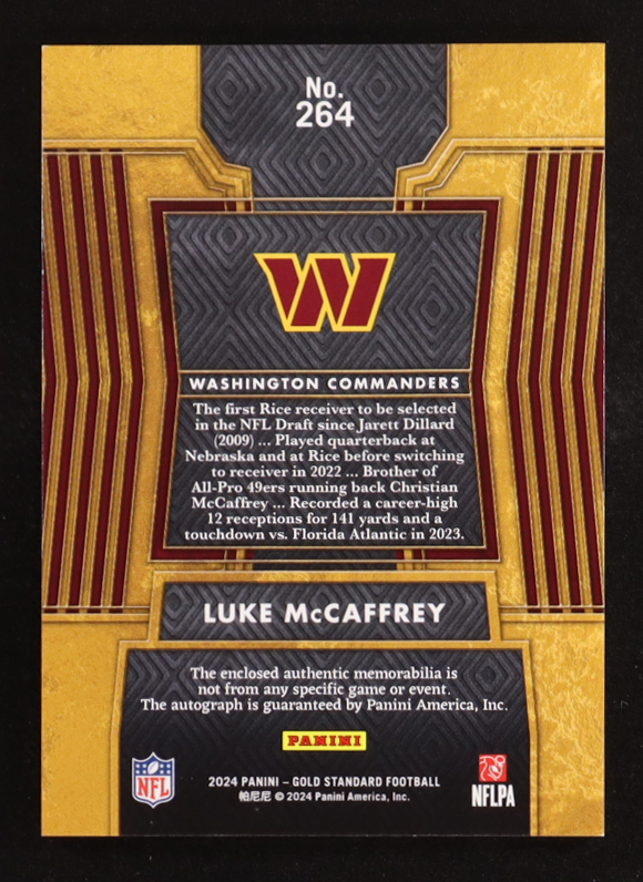 Luke McCaffrey 2024 Panini Gold Standard Rose Gold JSY Auto #264 RC #09/24