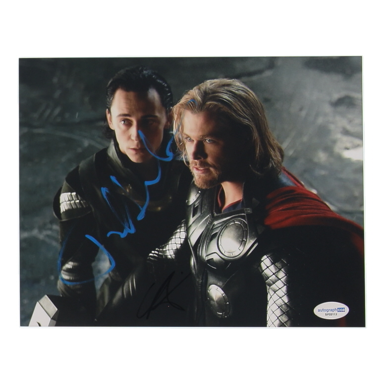 Photograph measures approximately 8" x 10" in size and has been hand-signed by Chris Hemsworth and Tom Hiddleston.