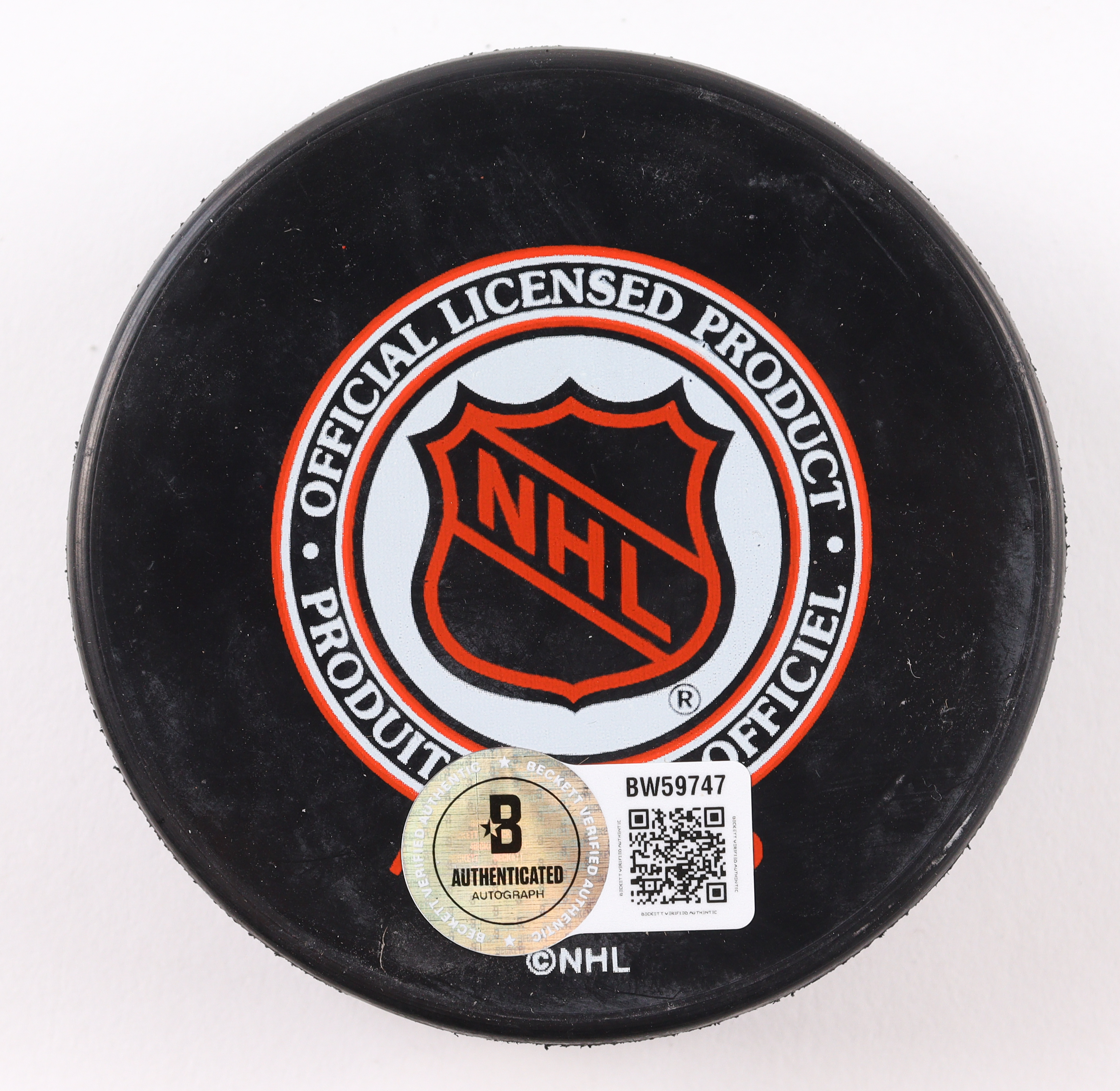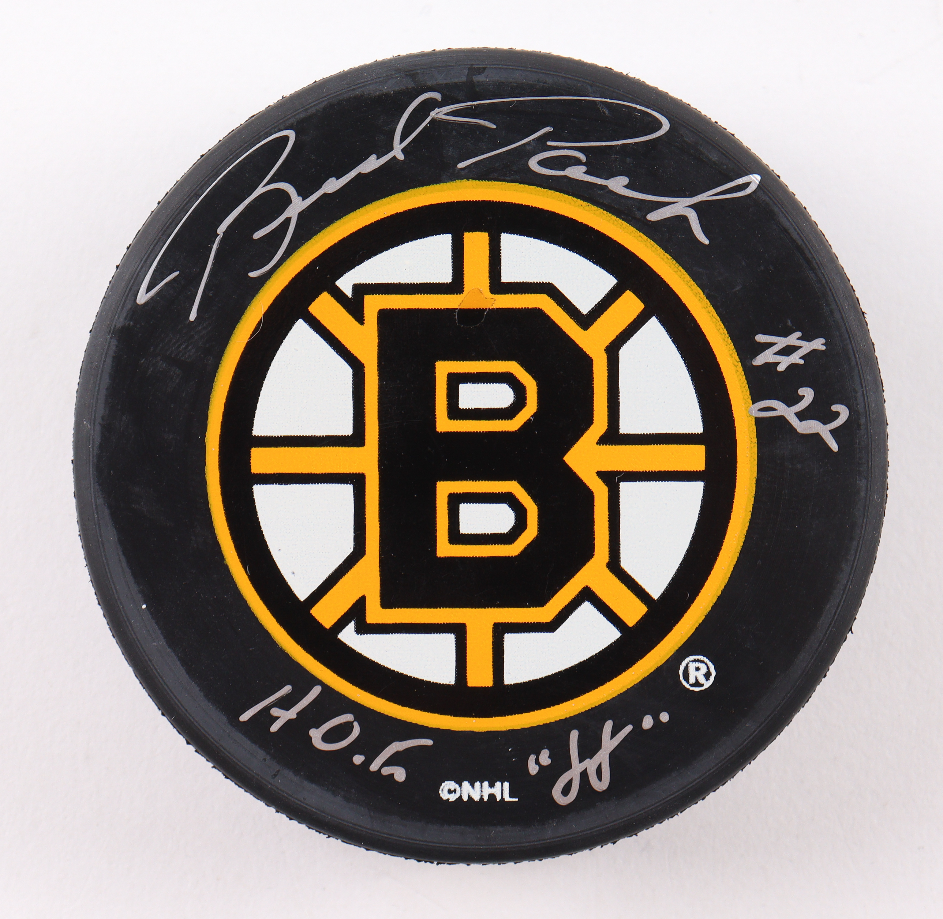 Boston Bruins Logo Hockey Puck. Hand-signed and inscribed by Brad Park (HOF). Please note, there are stains and scuffing throughout the puck.