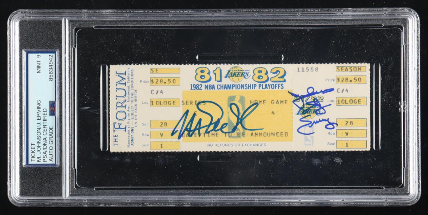 1982 Championship Playoffs ticket has been hand-signed by Magic Johnson (Los Angeles Lakers, HOF) and Julius Irving (Philadelphia 76ers, HOF) and graded (PSA 10). Please see photos for details regarding the item.