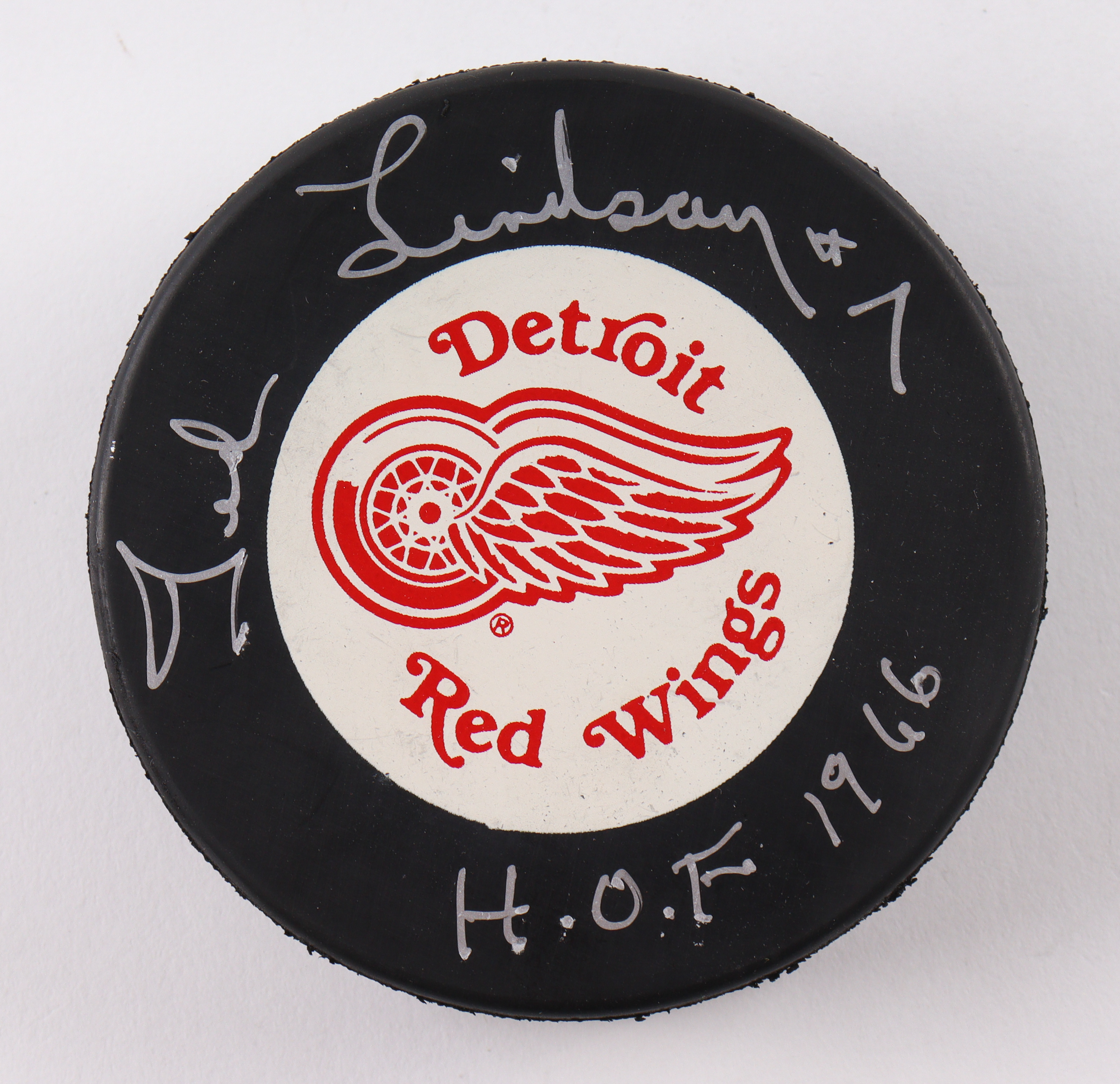 Ted Lindsay Signed Detroit Red Wings Logo Hockey Puck with Display Case Inscribed "HOF 1966" (Beckett)