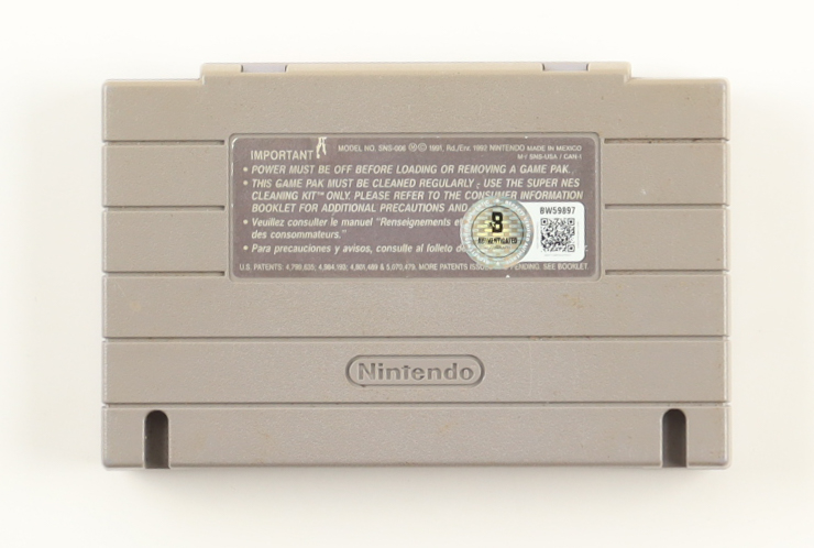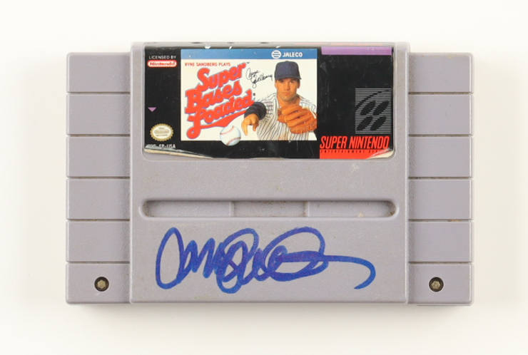 Nintendo video game cartridge for the Super Nintendo Entertainment System video game console is hand-signed by Ryne Sandberg (D. 2025, Chicago Cubs, HOF).