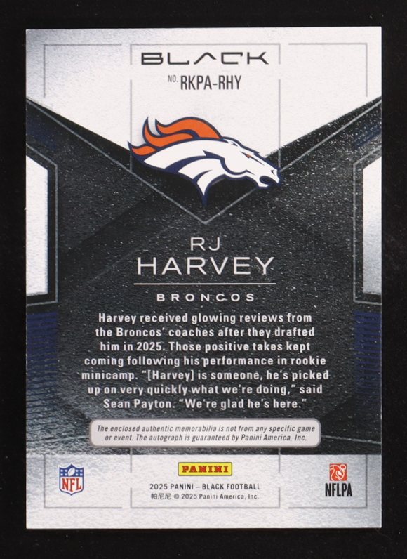 RJ Harvey 2025 Panini Black Rookie Patch Autographs Royal #RKPA-RHY #102/199