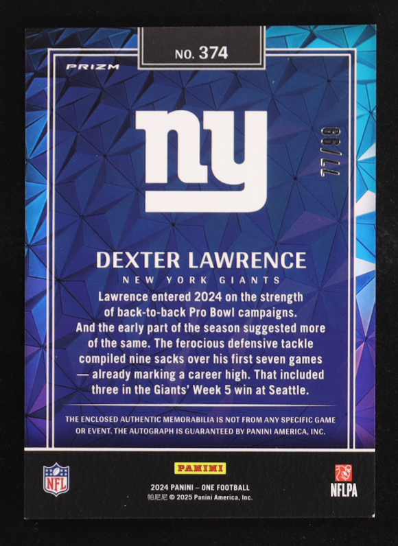 Dexter Lawrence 2024 Panini One Wonderful Ones Patch Silver Auto #374 #77/99