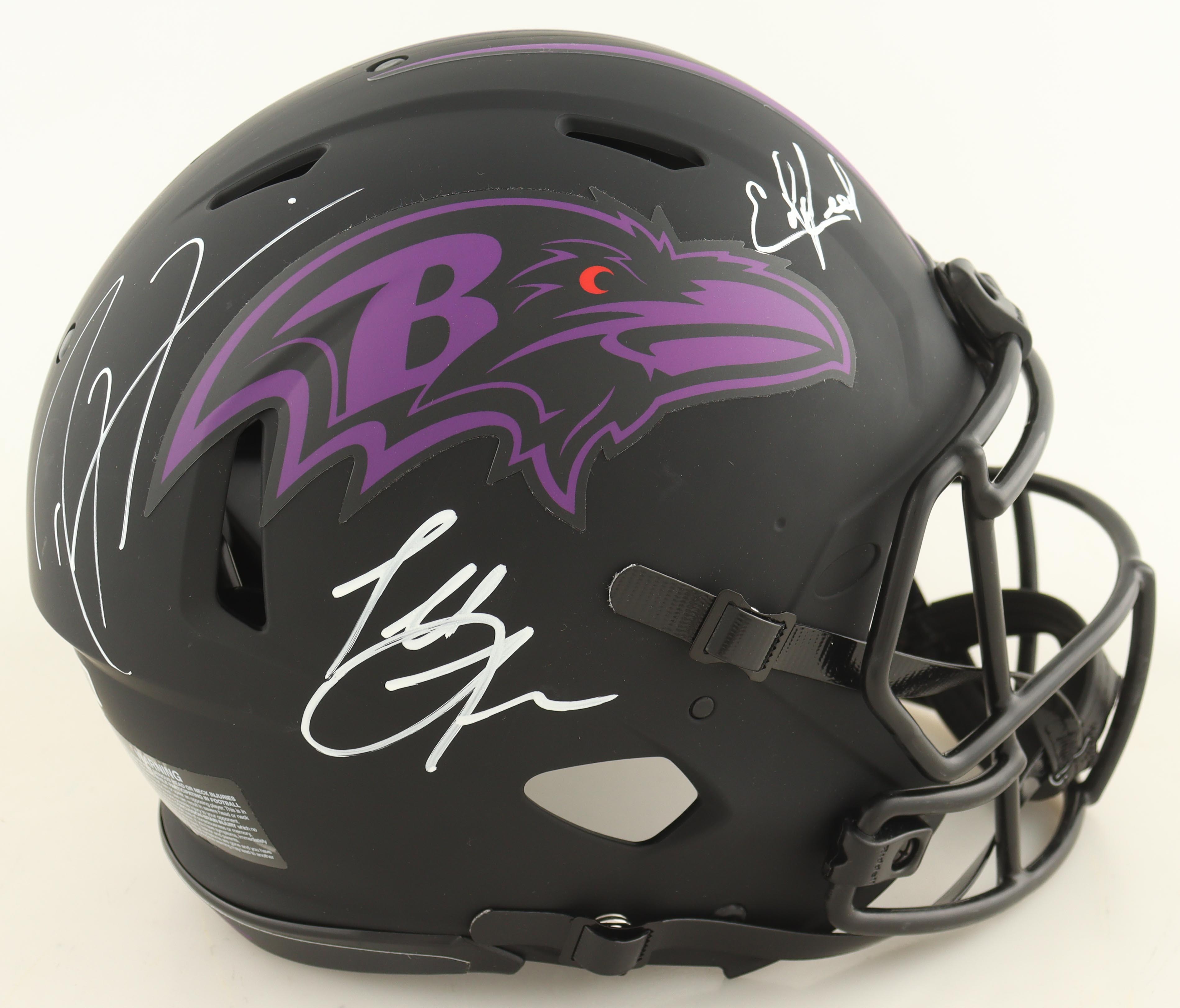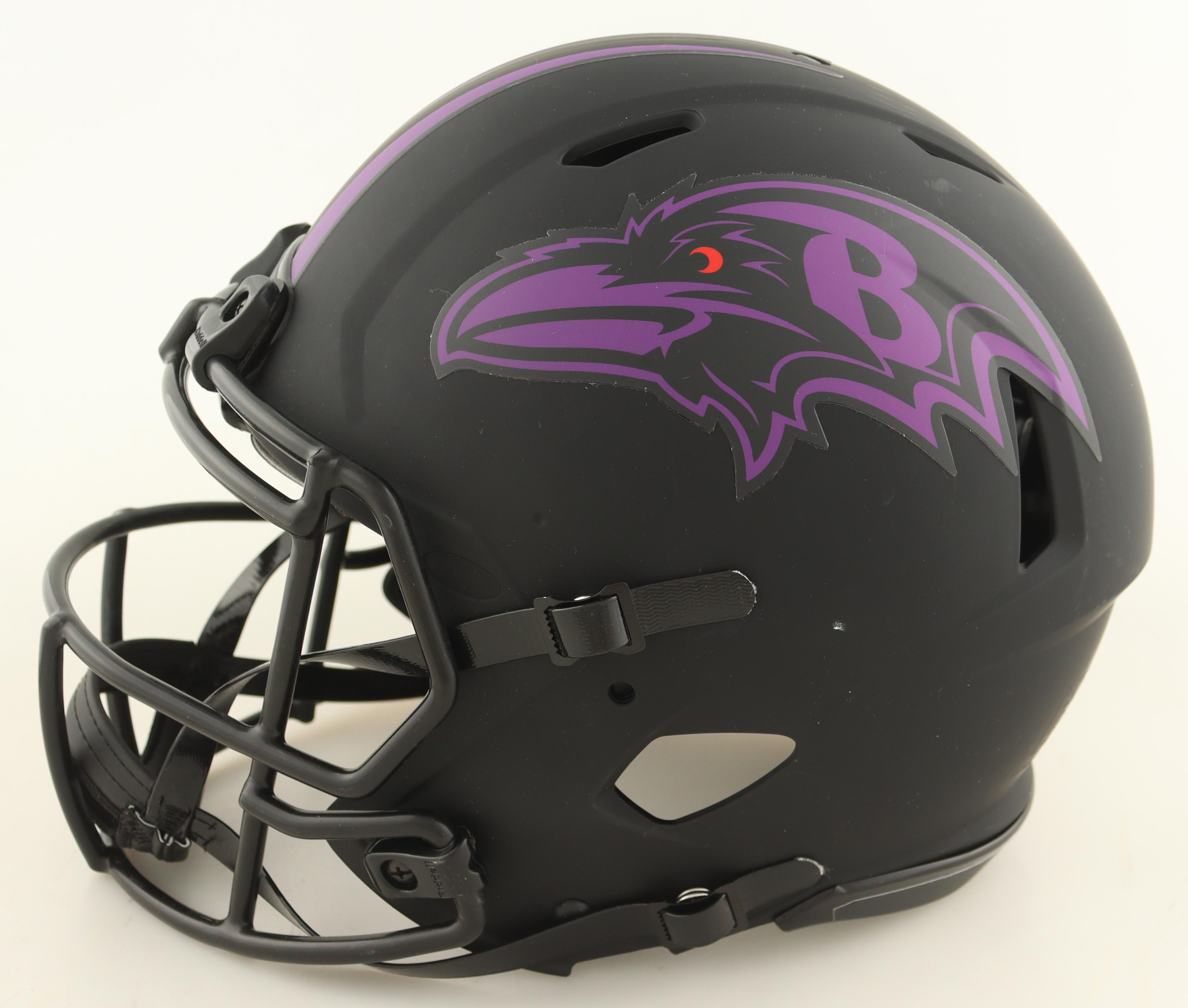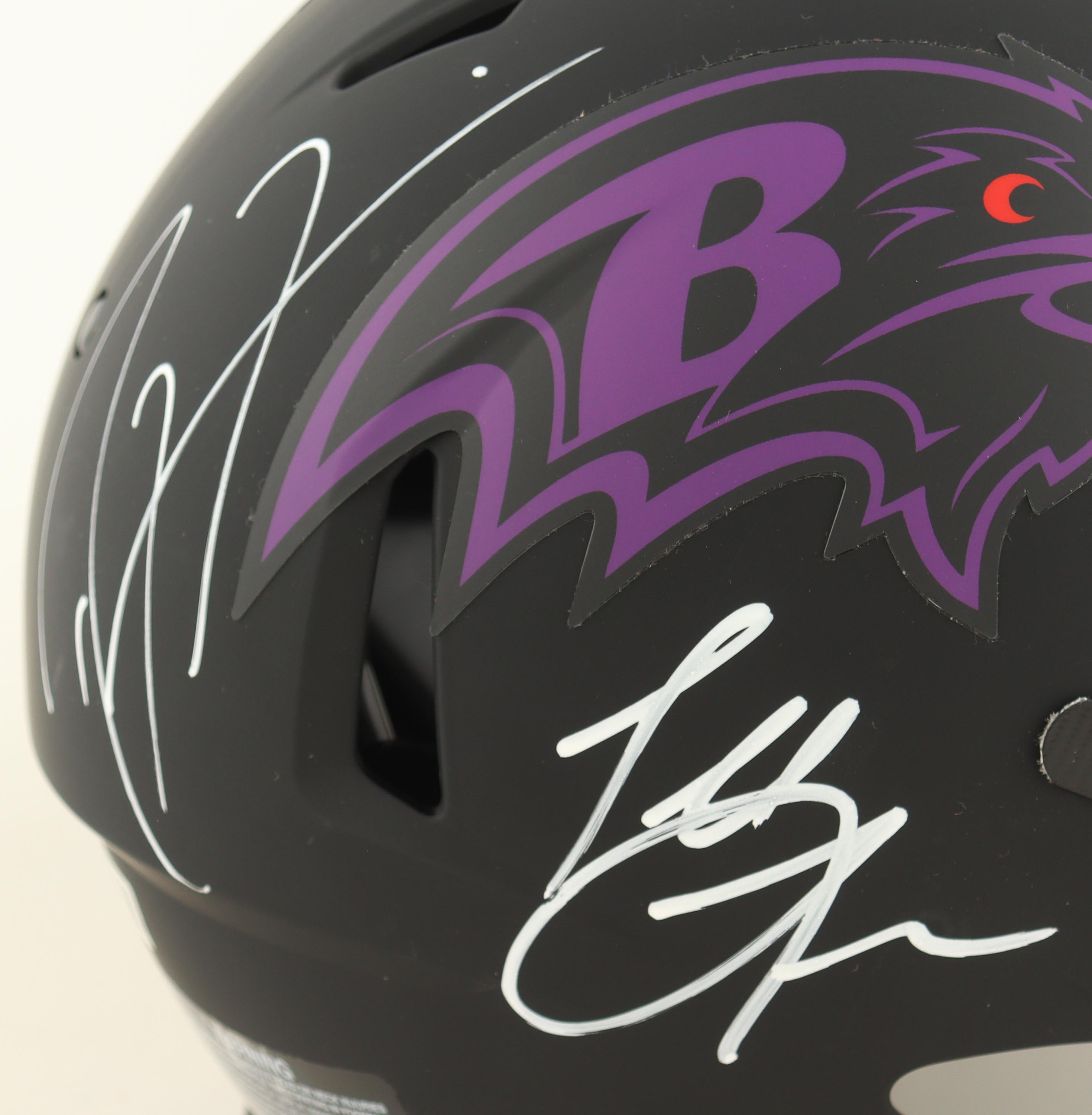 Riddell Baltimore Ravens full-size authentic on-field rave alternate speed helmet. Hand-signed by Ed Reed (HOF), Ray Lewis (HOF), and Terrell Suggs.