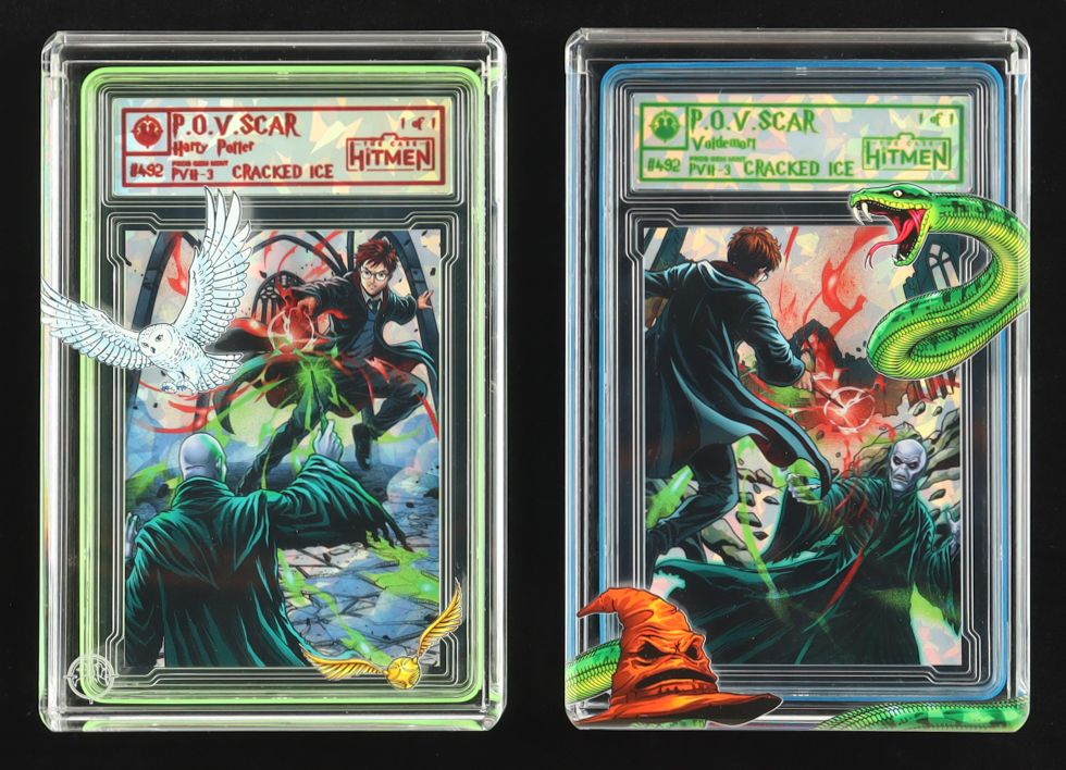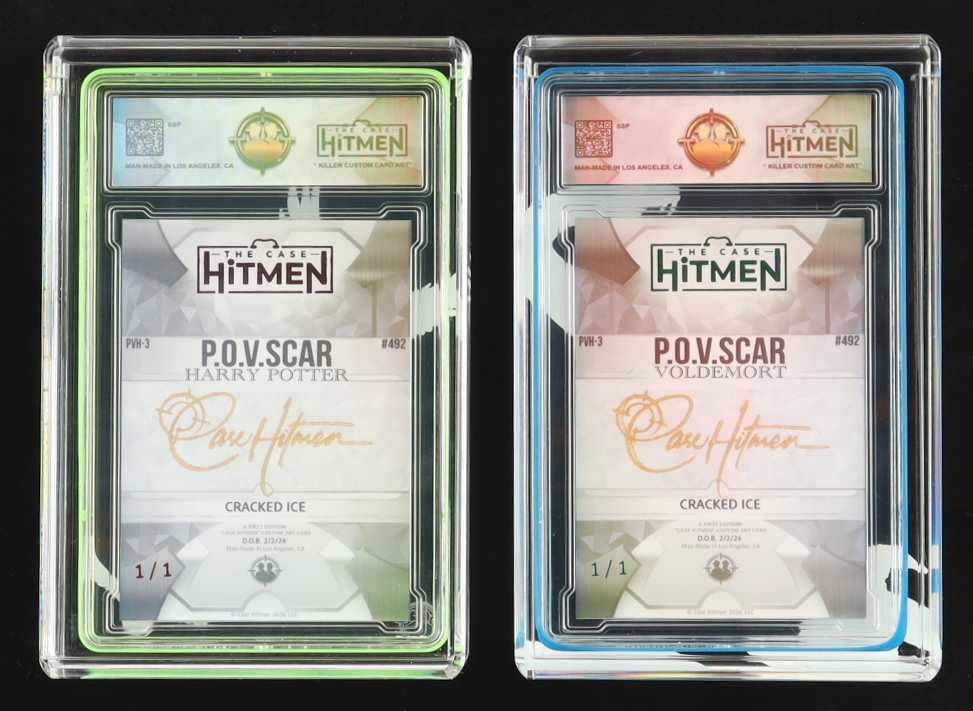 Set of (2) Harry Potter & Voldemort "P. O. V. Scar" The Case Hitmen Custom Art Cards PVR-3 Cracked Ice #492 #1/1 with (2) Custom Coins & Display Box