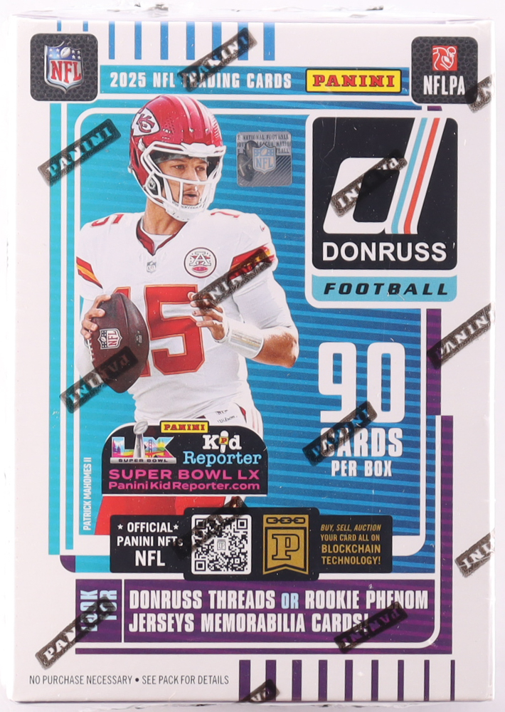 Panini presents the 2025 Donruss Football Trading Card Blaster Box. Each box contains 6 packs with 15 cards per pack. Look for Retail Exclusive Red Hot Rookies! Look for the Ultra-Rare Downtown Inserts! Look for Donruss Threads or Rookie Phenom Jerseys Memorabilia Cards!