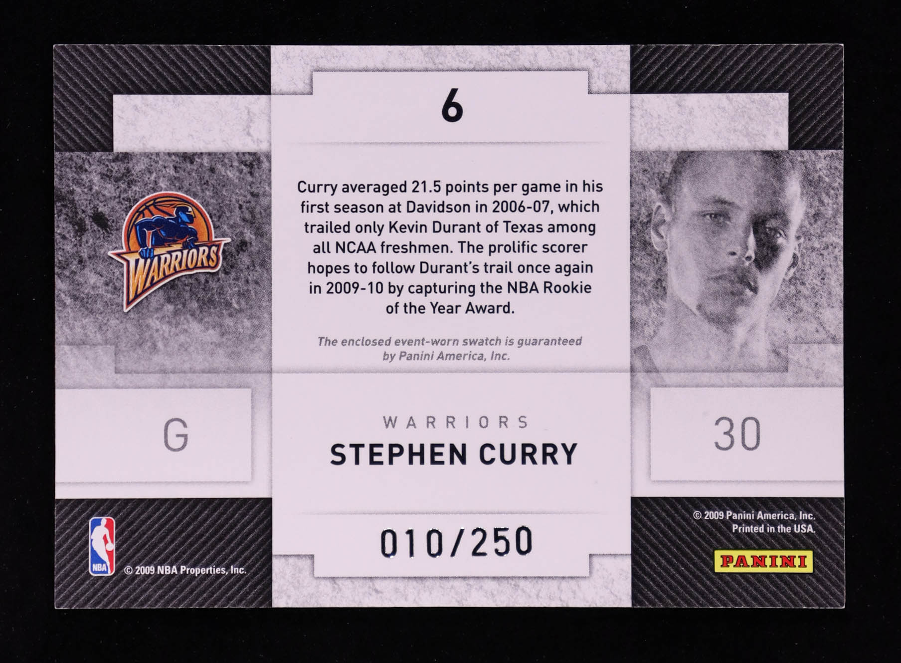 Stephen Curry 2009-10 Panini Threads Rookie Collection Materials #6 #10/250 RC